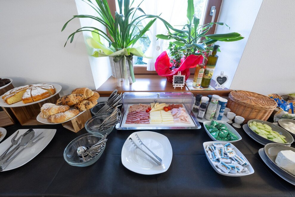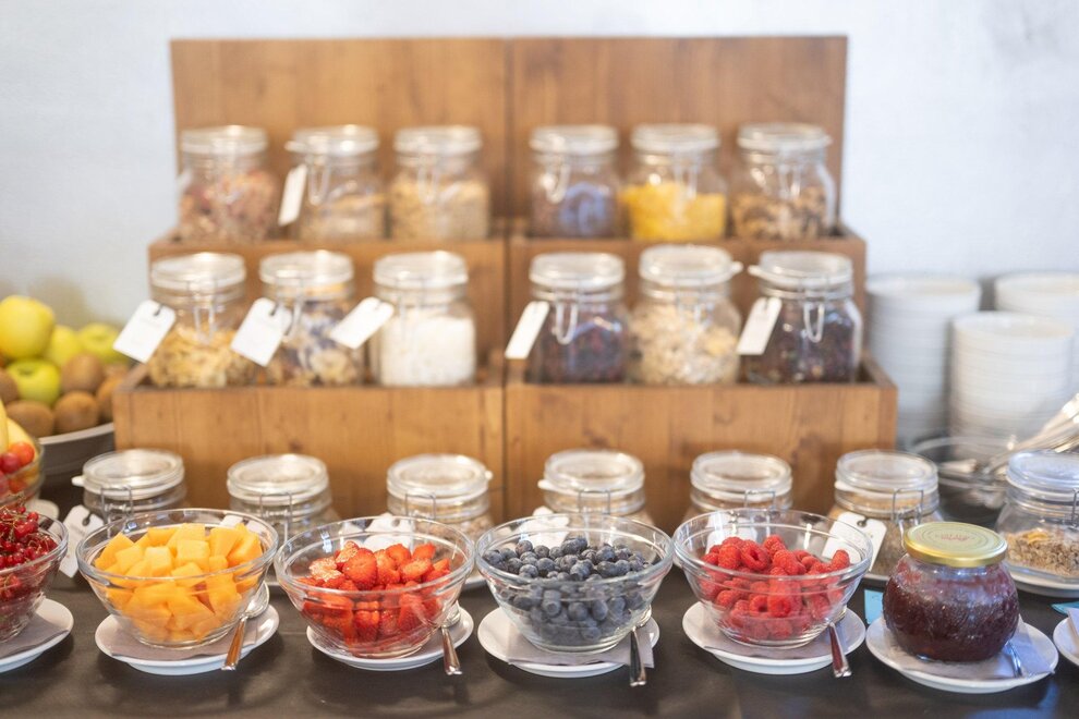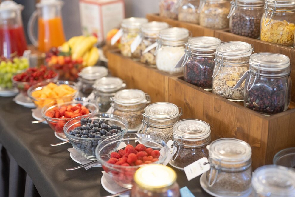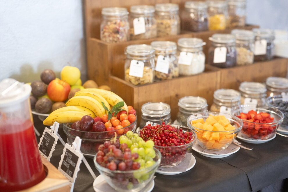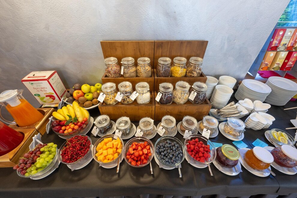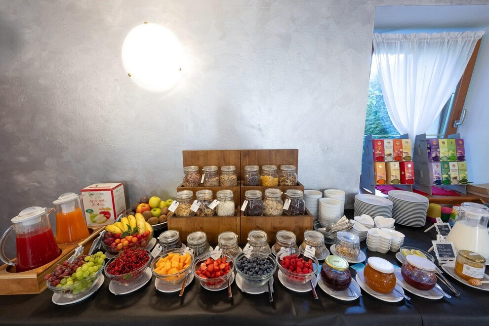 Śniadanie w formie bufetu ze świeżych owoców, domowe ciasta i dżemy, jogurty i masło produkowane w Trentino ...