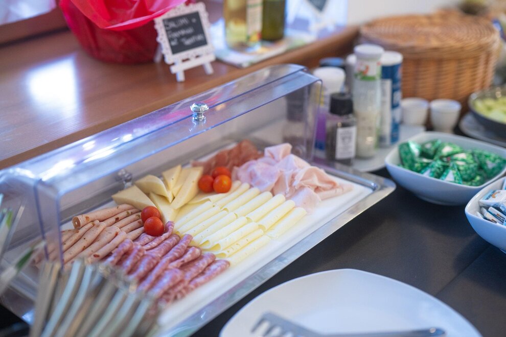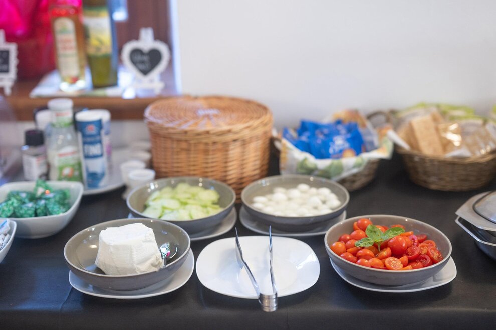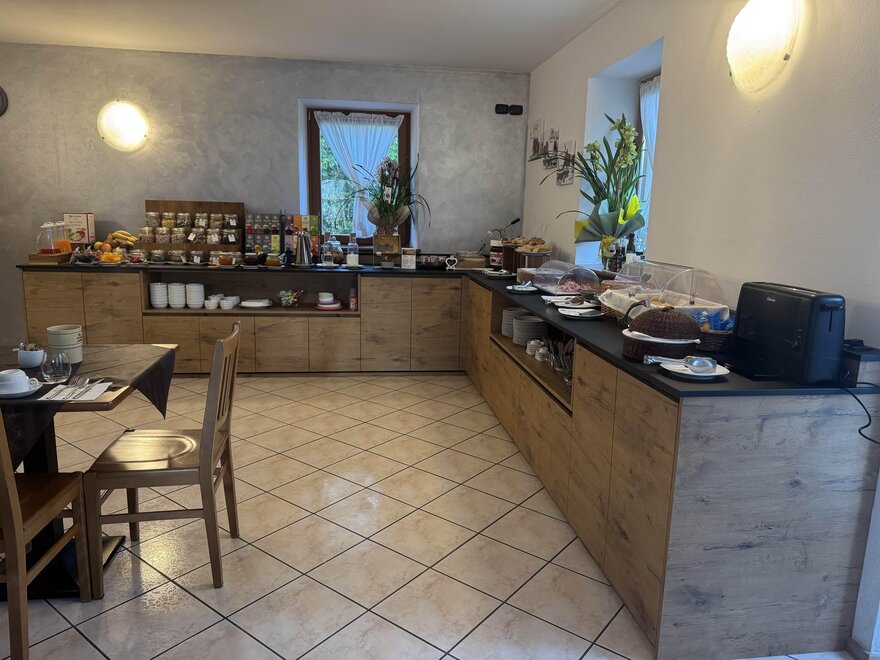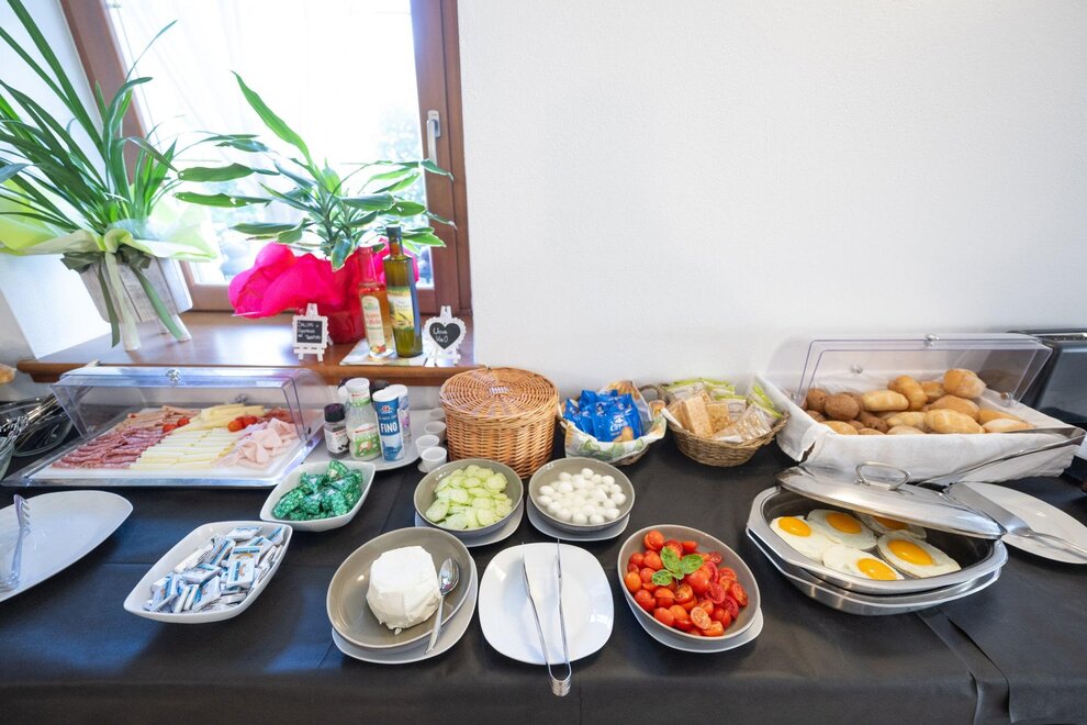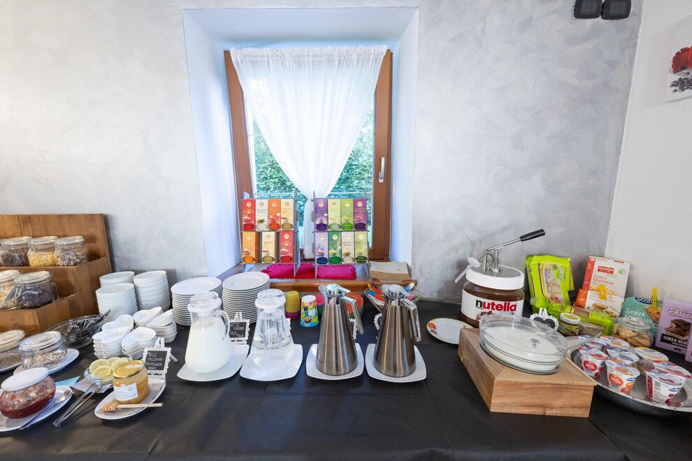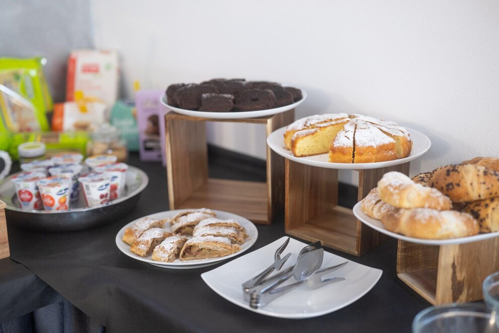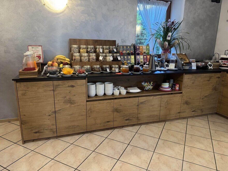 Śniadanie w formie bufetu ze świeżych owoców, domowe ciasta i dżemy, jogurty i masło produkowane w Trentino ...
