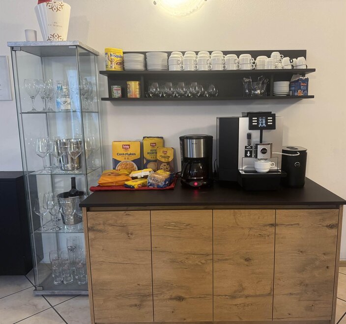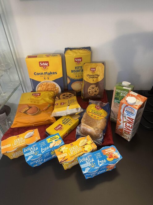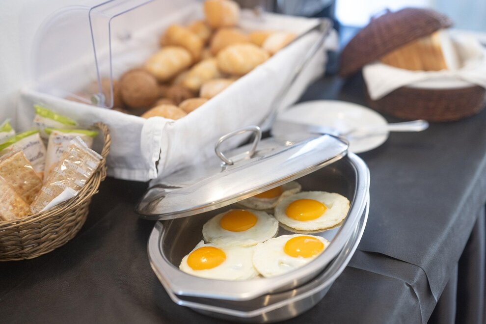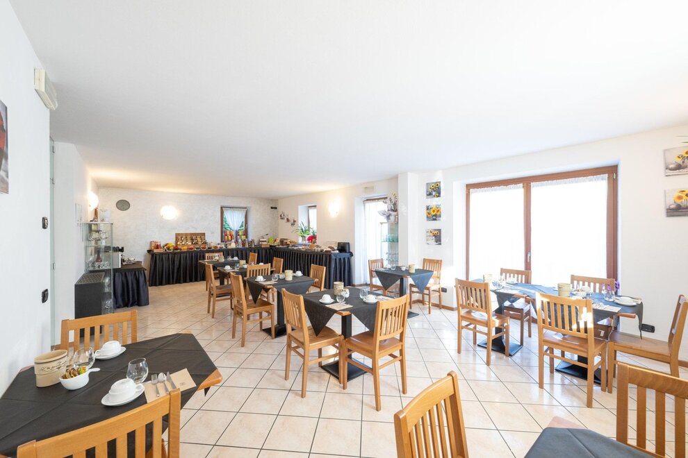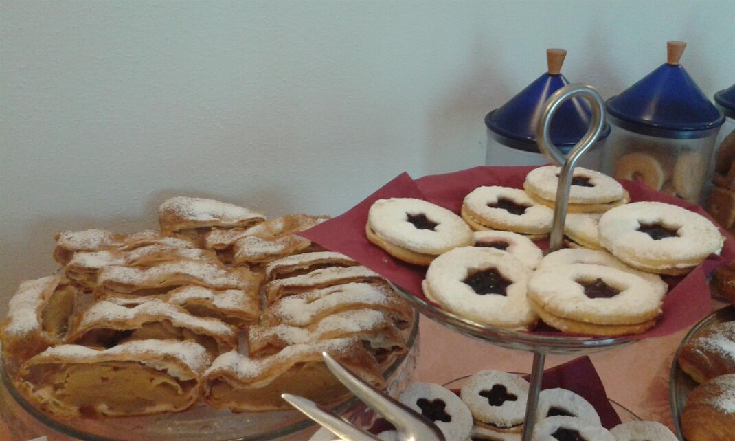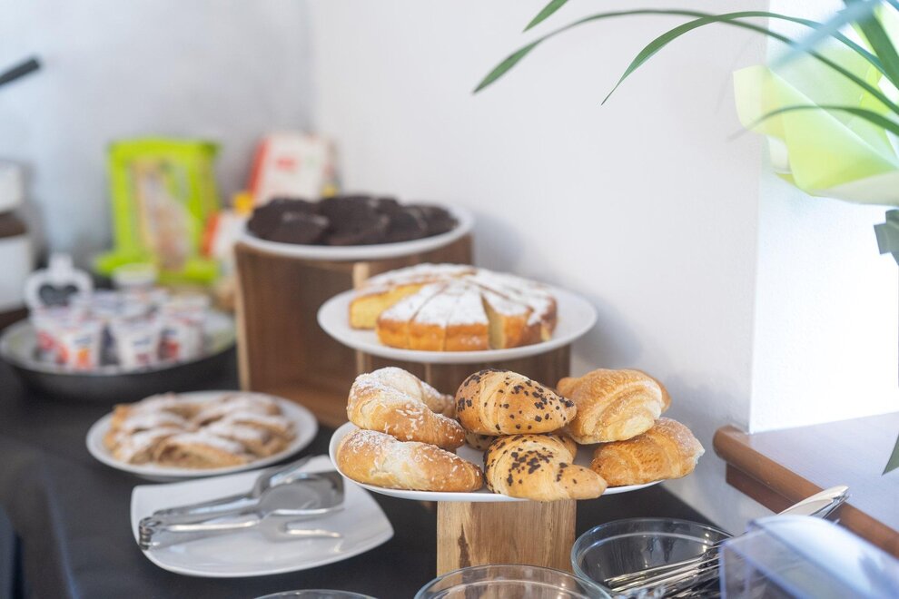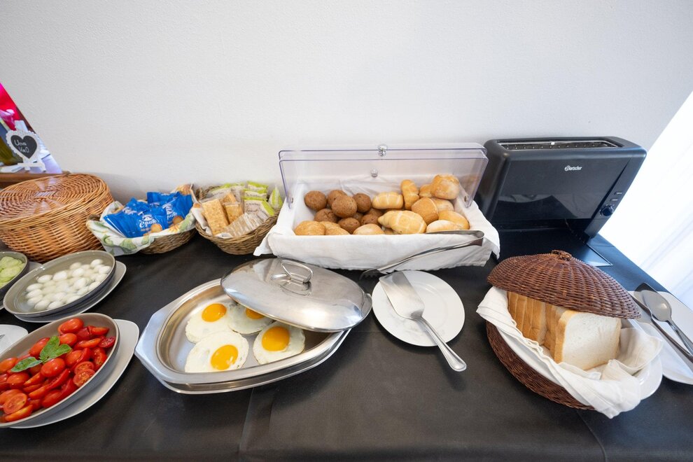 Śniadanie w formie bufetu ze świeżych owoców, domowe ciasta i dżemy, jogurty i masło produkowane w Trentino ...