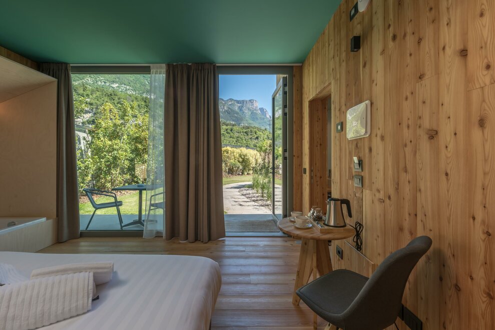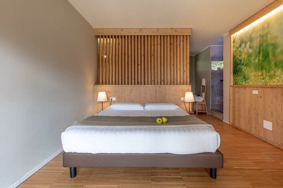 Víno je jedním z nejdůležitějších typických produktů Trentina a tento prostorný pokoj s vlastní terasou je srdečným poctou „nektaru bohů“. Zde dřevo podle geometrických linií „orámovává“ lahodnou zážitkovou mozaiku.