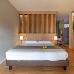 Vstoupit do této Junior Suite je jako ocitnout se ve snu. Vířivka u nohou postele, všudypřítomné dřevo a jasné okno, které poskytuje přímý přístup do zahrady, činí pobyt nádhérně.