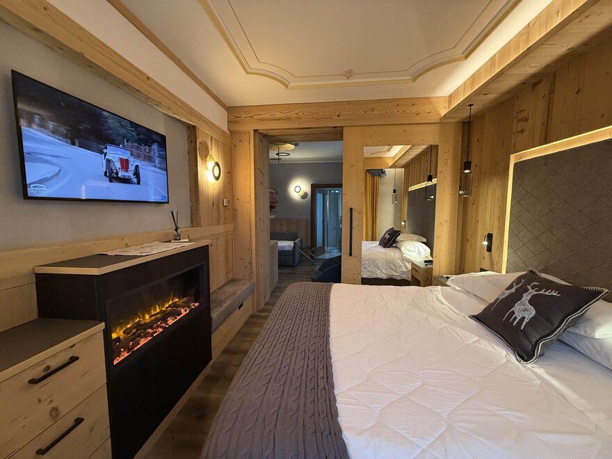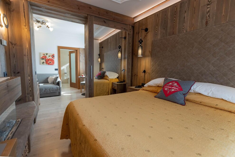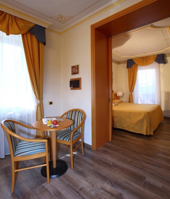 Manželský pokoj nebo pokoj se 2 lůžky s odděleným salonkem s posuvnými dveřmi, vybaveným rozkládací pohovkou a případným čtvrtým lůžkem, se službami s sprchou nebo vanou, fénem, minibarem, trezorem, všechny s balkonem, LCD TV se 6 kanály SKY, telefon.