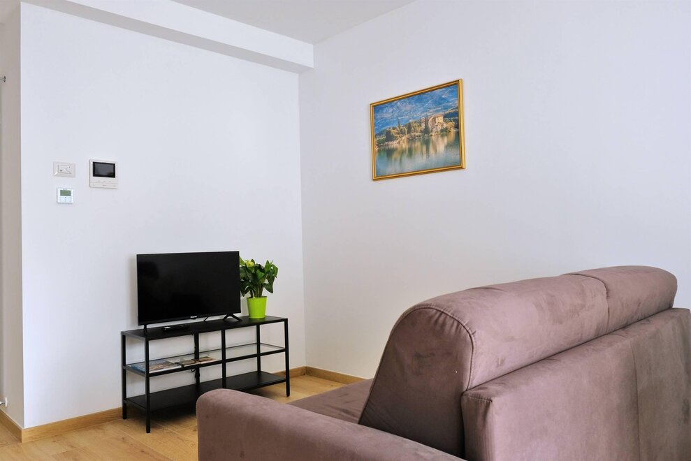 Obývací prostor disponuje smart TV, jídelním koutem a rozkládací pohovkou pro 3 osoby, kterou lze na požádání přeměnit na dvoulůžko pro třetí/čtvrtého hosta. Prostorná koupelna se sprchou.