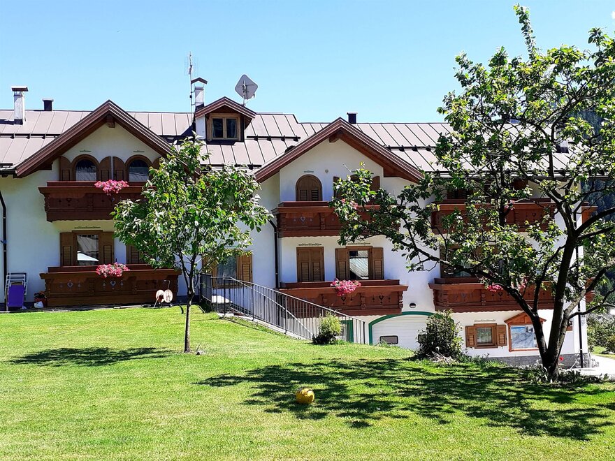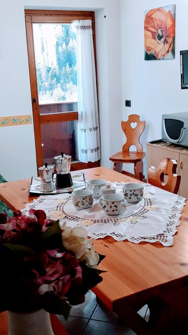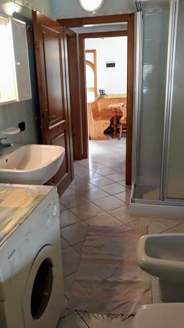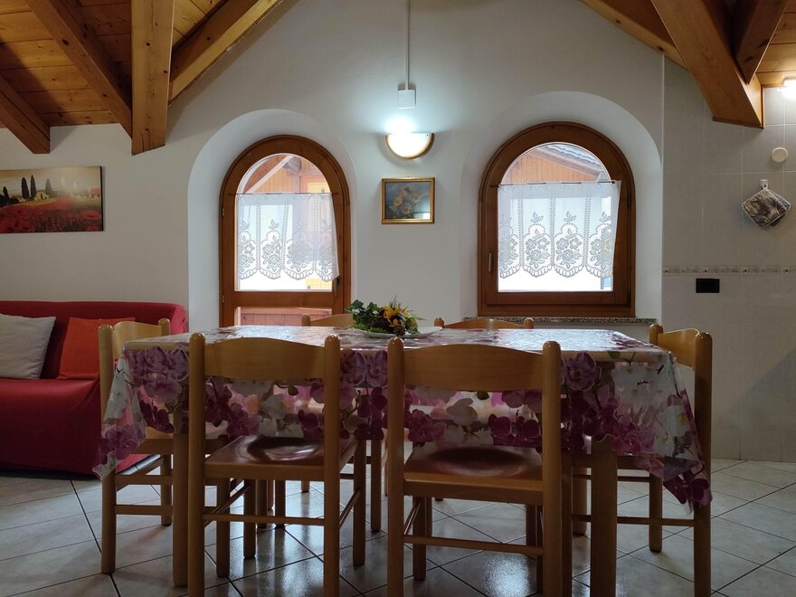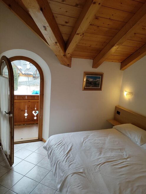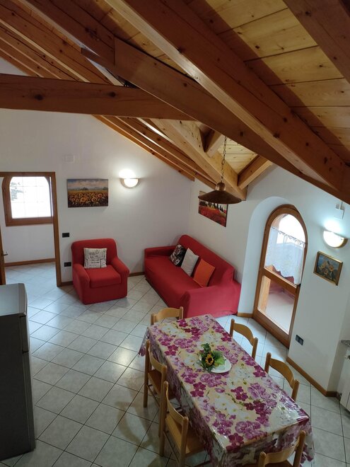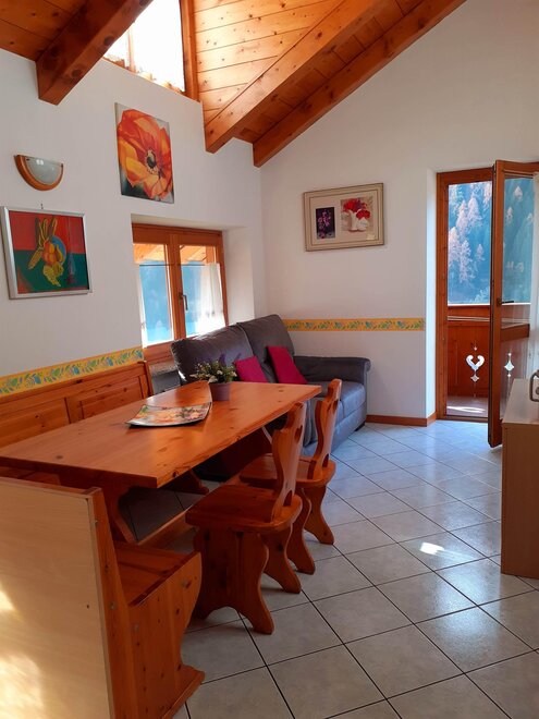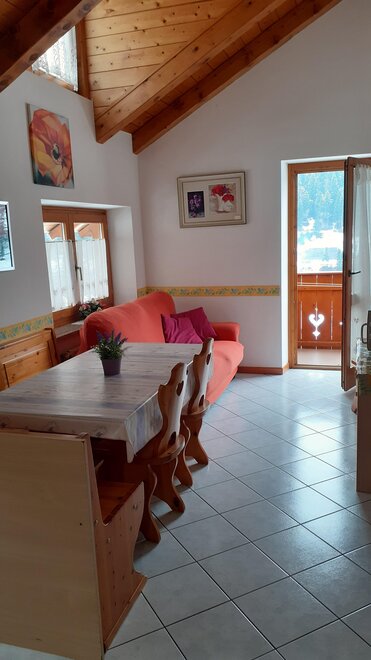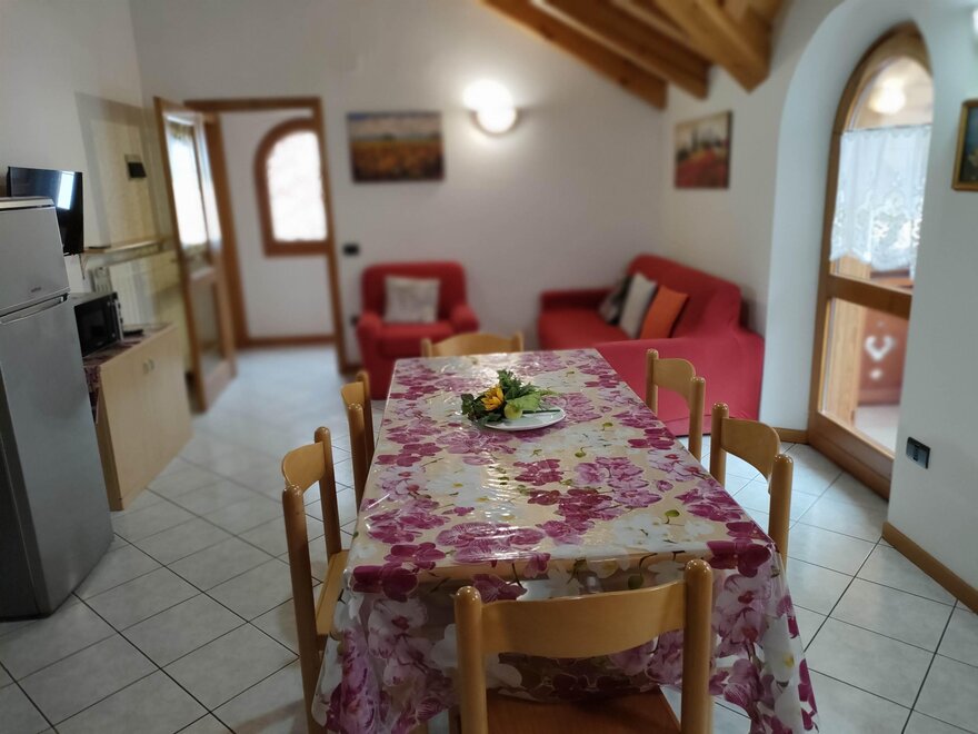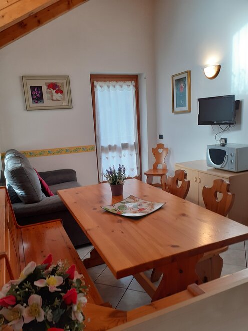 The apartments are bright and welcoming. They have a fully equipped kitchen with an oven, fridge, TV, microwave, a double sofa bed, a bedroom with 2-3 single beds, a double bedroom, a bathroom with a shower, and balconies with mountain views. Shared facilities include a laundry and ironing room. There is an outdoor parking space, a private courtyard and a ski storage area. Internet connection service is available upon request.