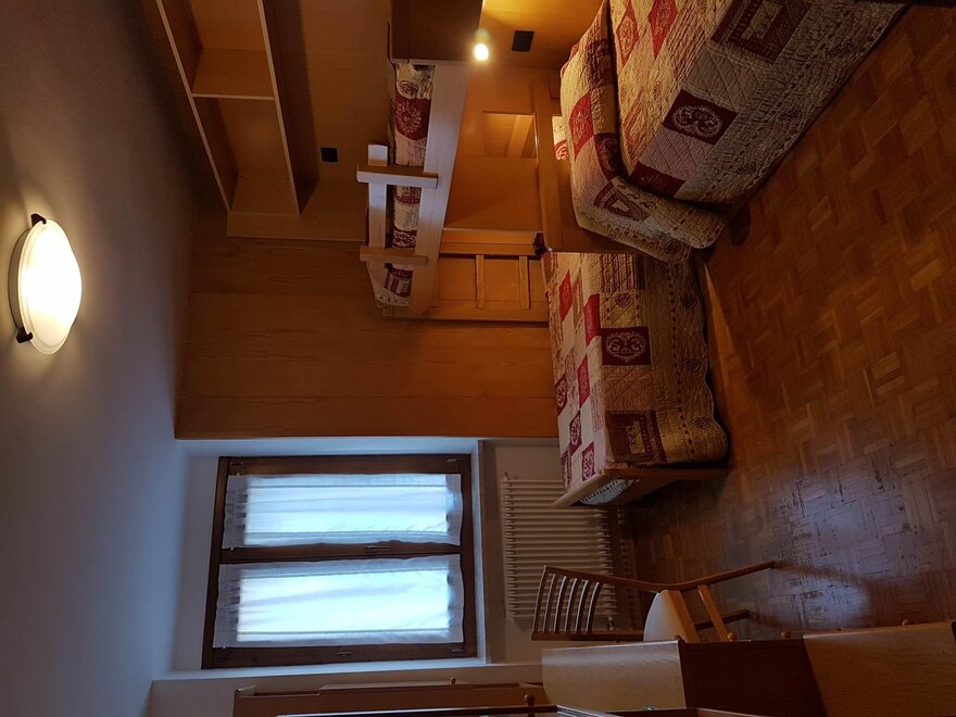 Apartmán Piz Galin se nachází v prvním patře budovy, skládá se z obývacího pokoje s kuchyňským koutem, manželské ložnice s patrovou postelí a koupelny.