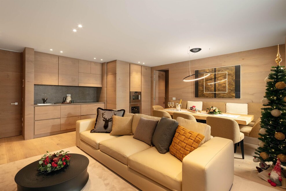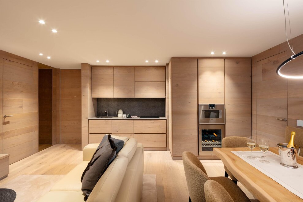 Elegantní jídelna doplňuje obytný prostor, ideální pro rodinné večeře. Dvě manželské pokoje, každý se svou vlastní koupelnou, vyzařují současný alpský design pro relaxační útočiště.
