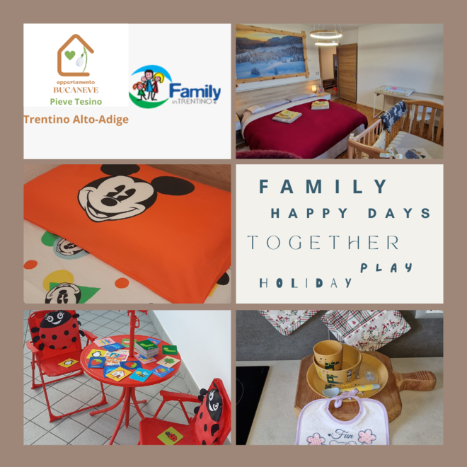 Byt je certifikován jako “Family in Trentino”, což je znak pozornosti k rodinám. Nabízíme vybavení pro nejmenší, nerozbitné nádobí, ohřívač kojeneckých lahví, dřevěnou postýlku, barevné a přizpůsobené sady podle věku dětí/mladistvých, zábranu proti pádu, vysokou židli, přebalovací pult, bryndáky, vaničku na koupele, vybavení na piknik (nádobí, batoh), stolní hry, výběr dětských knih, KIT-minilaboratoř pro nejmenší, KIT-první pomoc.