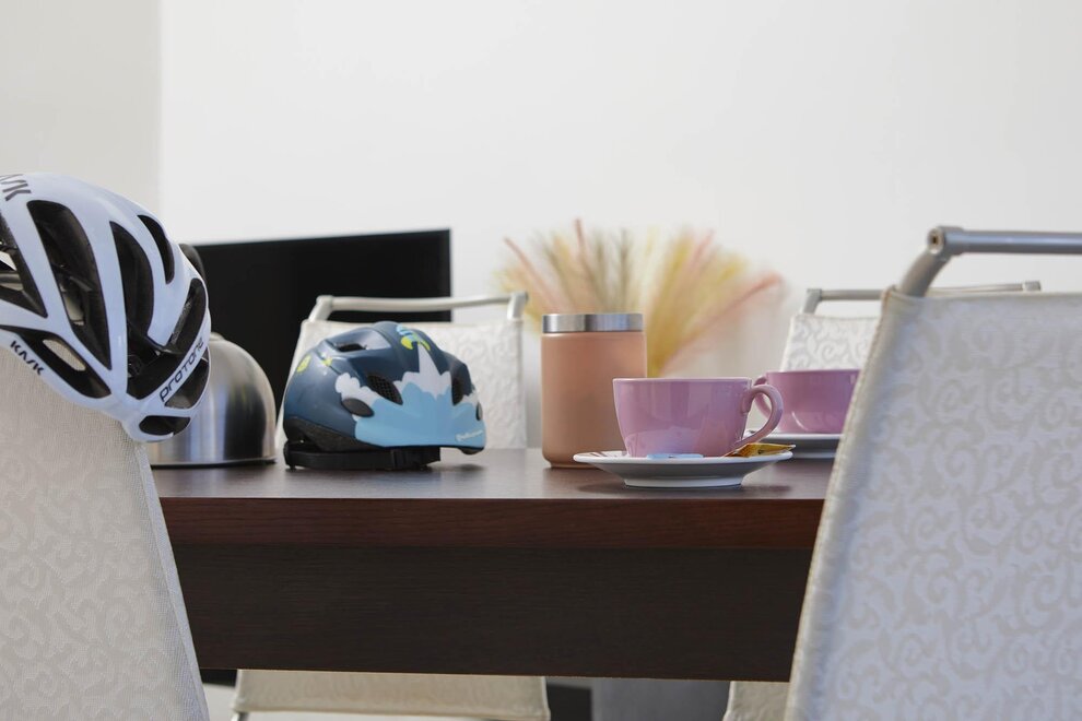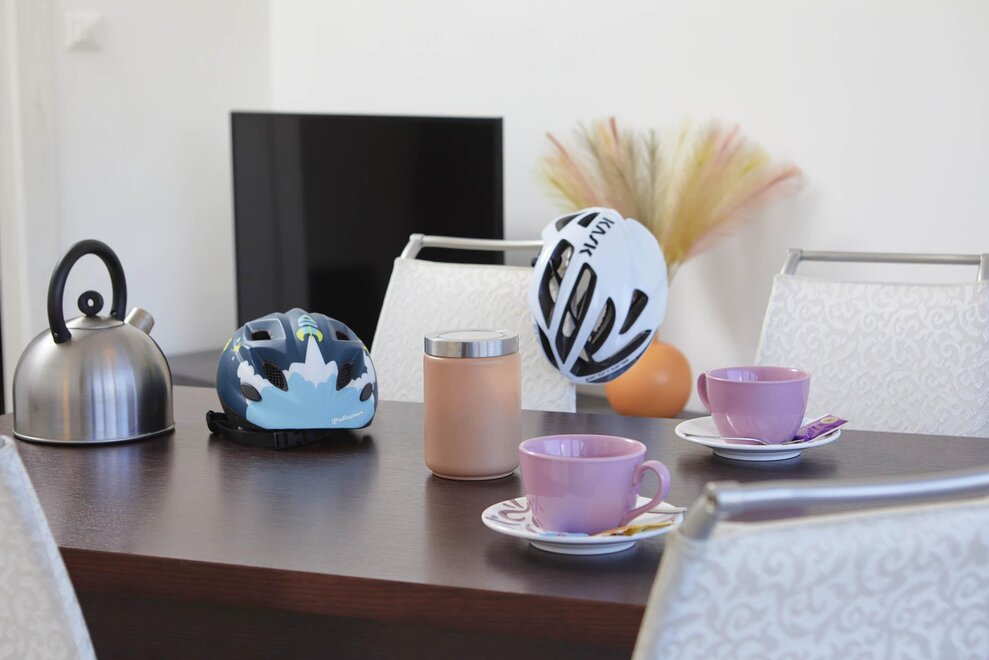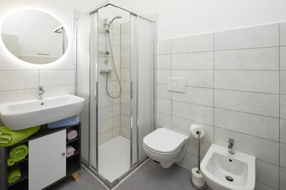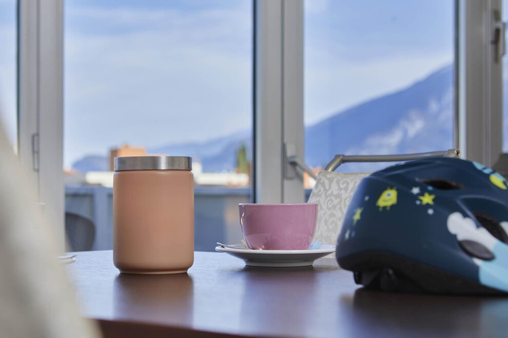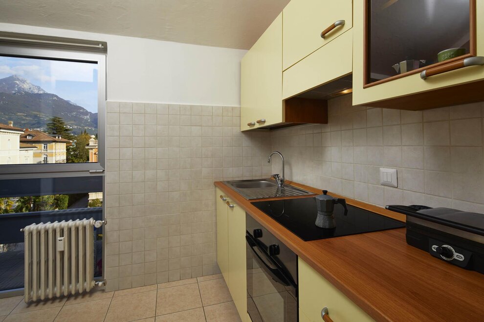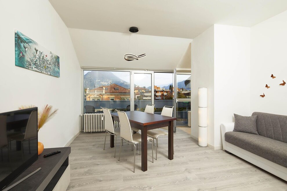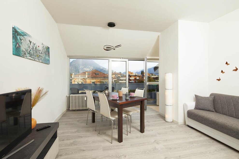 Byt o rozloze 72 m² se skládá z prostorného obývacího pokoje s pohovkou, smart TV a klimatizací, nádherného balkonu s pohovkami a stolečkem s výhledem na hory obklopující Rivu, vybavené kuchyně s veškerým potřebným zařízením, koupelny se sprchou, prostorné ložnice s manželskou postelí, světlého pokoje se dvěma jednolůžky, který lze přeměnit na další manželskou ložnici, skladovací místnosti a velmi užitečné sklepní místnosti jako úložiště pro kola nebo zavazadla.