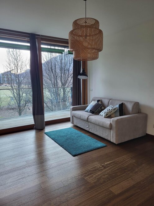 Obývací pokoj je velmi světly, protože místo oken jsou zde široká prosklená okna, která přímo vedou na balkon.Apartmá je přístupné prostřednictvím pěší cesty jak zvenčí, tak z parkovací zóny (také výtahem).