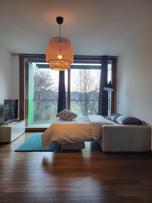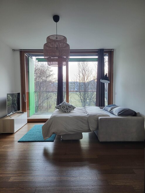 kuchyň, ručníky k dispozici, dřevěná/parketpvá podloha, myčka nádobí, klimatizace, TV, oddělený obýv./ložnice, topení, pračka, povlečení k dispozici, balkón, lednice, prostírání a prádlo do kuchyně, žehlička, nádobí k dispozici, trouba, mikrovlnná trouba, hasicí přístroj, základy (Ručníky, povlečení, mýdlo a toaletní papír), obytná kuchyň, varná konvice, toaletní prádlo, prošívané deky, využití pračky, toustovač, vlasový fén, detektor oxidu uhelnatého, možnost vaření, kuchyňské nádobí