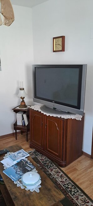 Living room with TV and computer with wifi, bathroom with towels and accessories.