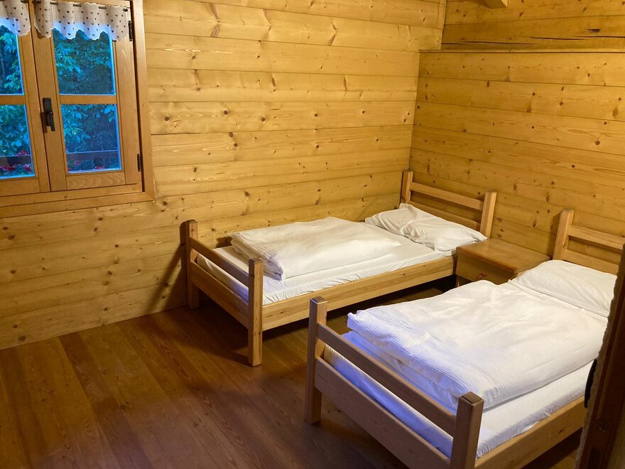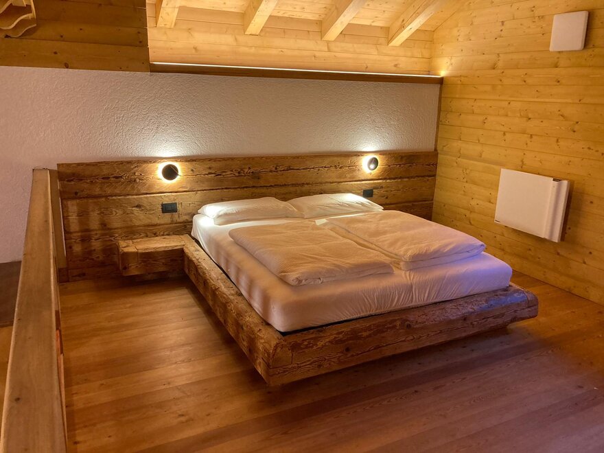 Ještě dvě schody a dostanete se do druhého patra, s manželskou postelí vyrobenou z trámů střechy. Vedle, odděleně, je další dřevěná místnost se dvěma jednolůžky.
