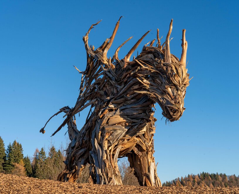 Six meters high and seven meters long, Vaia Dragon, composed of 2000 pieces of roots and tree wastes and 3000 screws, is the winged dragon that fascinates Europe. His incisive gaze is majestic and that trace of magic takes back to a far world.
