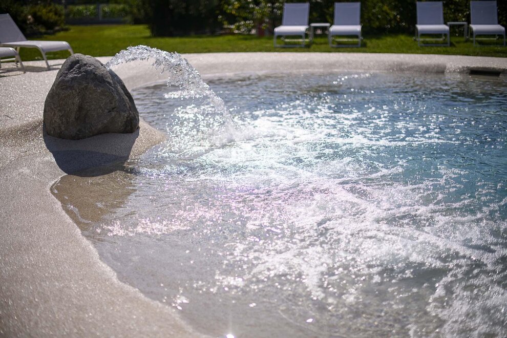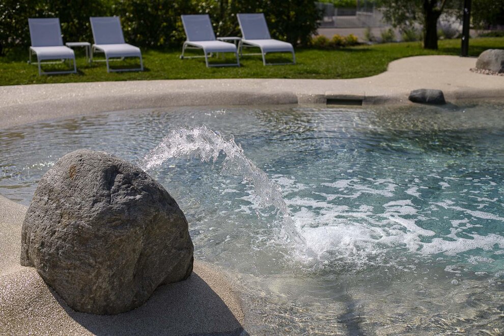 Přírodní bazén sterilizovaný solí nabízí oblasti s hydromasáží a vodními hrami.