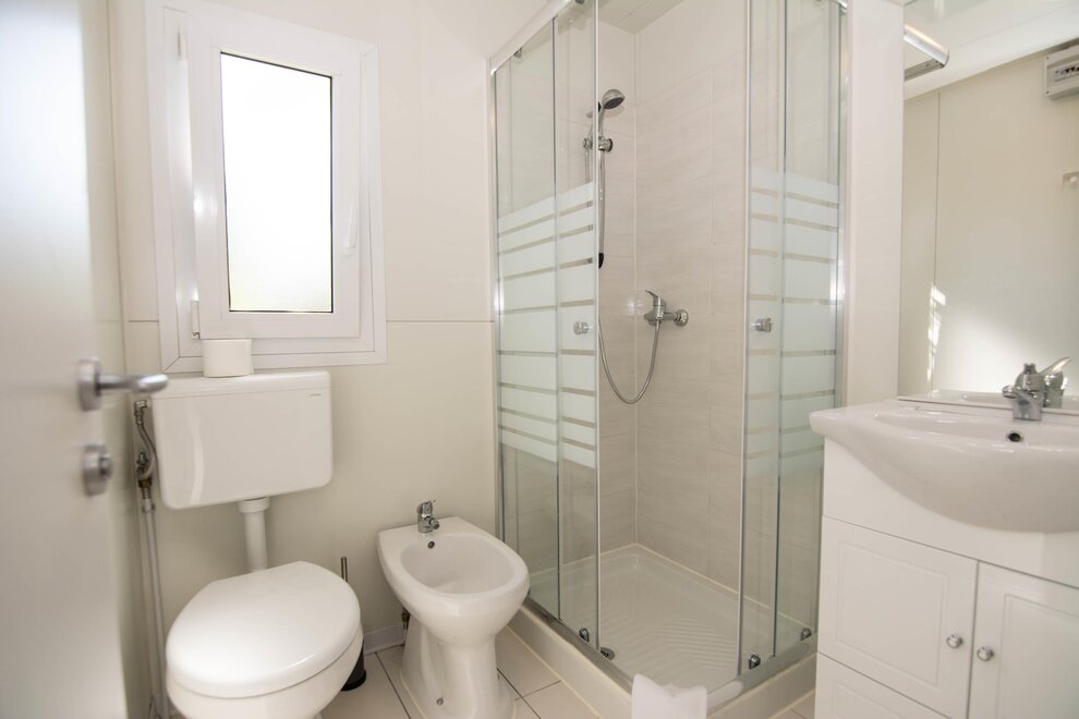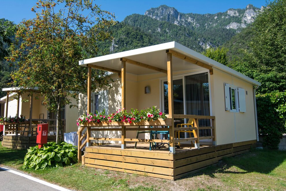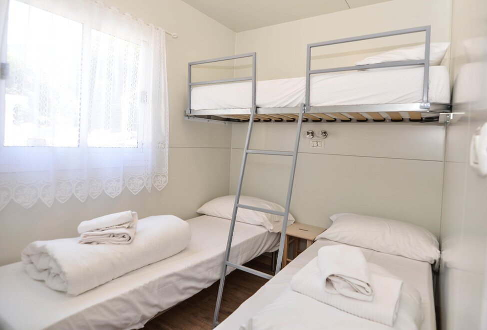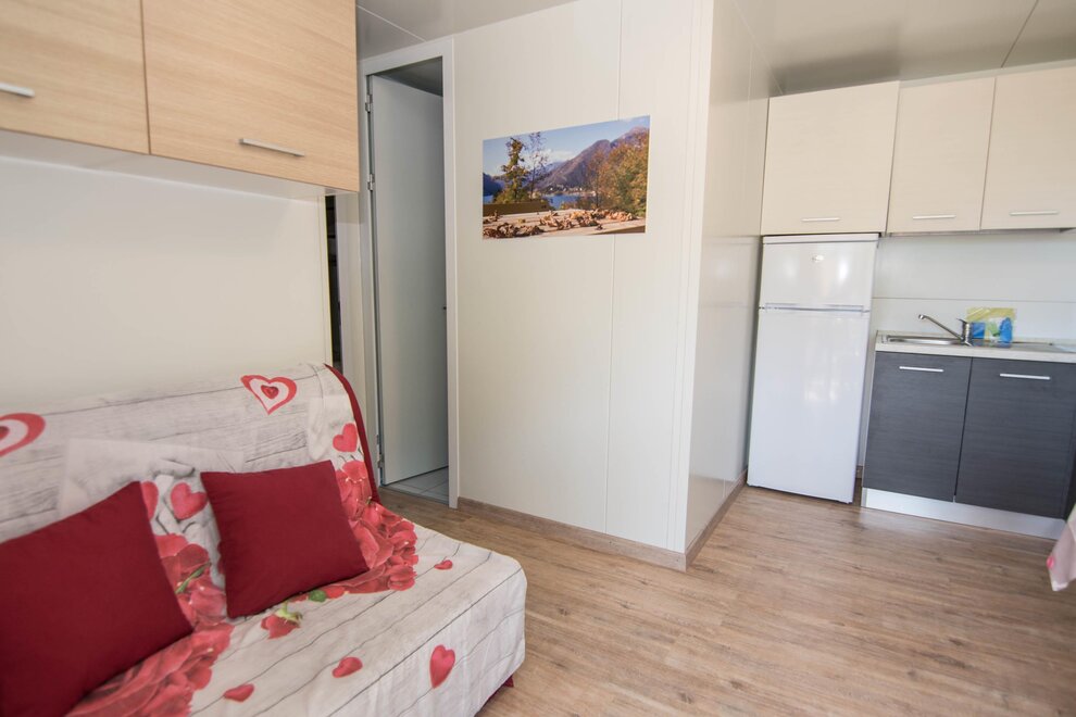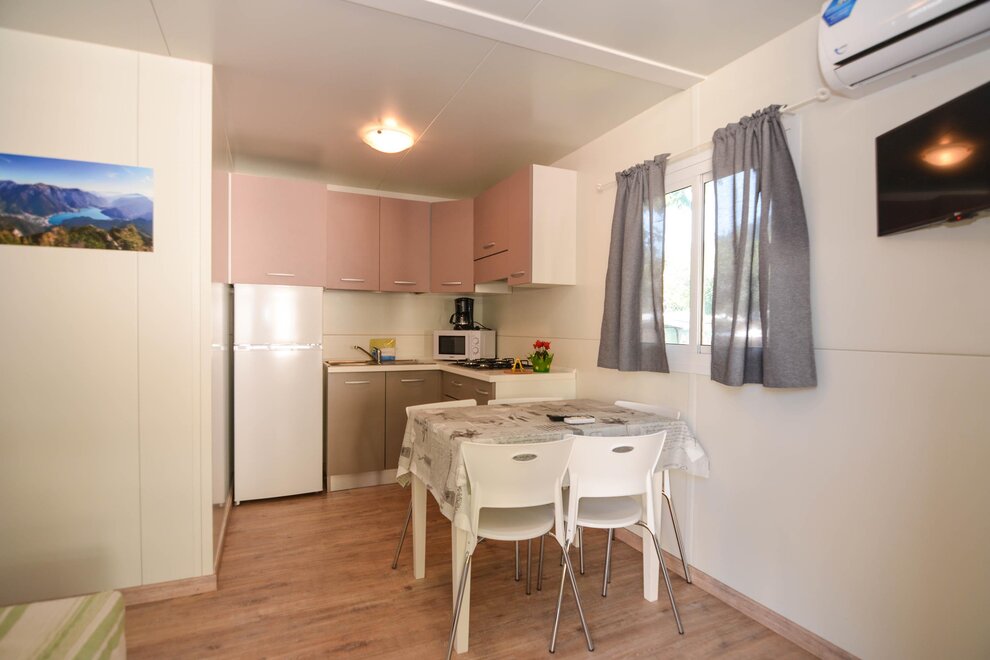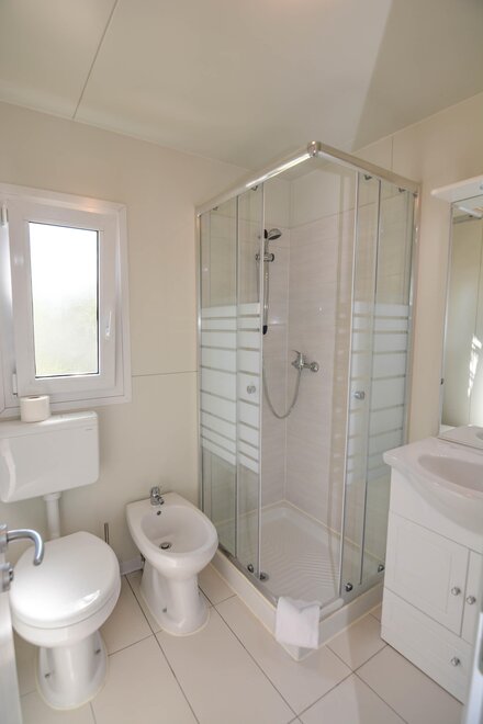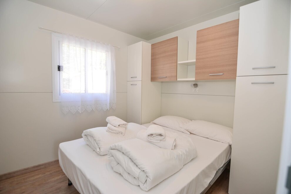 10 Nové mobilhomy, zařízené s vkusem a vybavené všemi pohodlími. Obývací pokoj s kuchyňským koutem, rozkládací manželská pohovka, lednice s mrazákem, německý kávovar, mikrovlnná trouba, klimatizace/ústřední topení, satelitní TV, dvě samostatné ložnice, jedna s manželskou postelí a jedna se dvěma nebo třemi jednolůžky, koupelna se sprchou. Externí veranda se stolkem a židlemi. Parkování