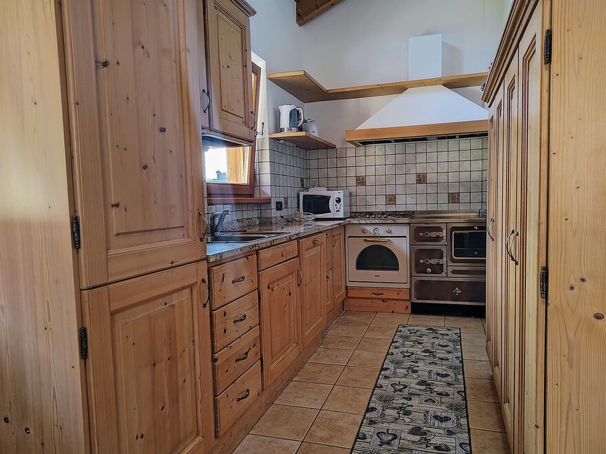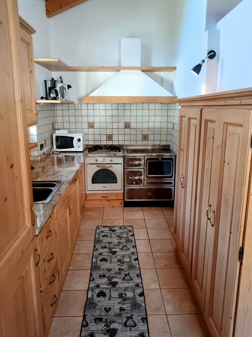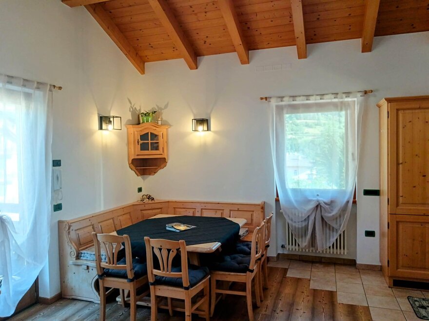 Po dřevěném schodišti se dostanete do otevřeného obytného prostoru, který je velmi světlý a s viditelnými trámy, kde se nachází plně vybavená kuchyň, pohodlná sedačka, smart TV a prostorný jídelní stůl se lavicí, ideální pro rodinné obědy a večeře. Druhé patro doplňují dvě slunné balkony, kde si můžete sednout a obdivovat nádherný výhled na Dolomity.