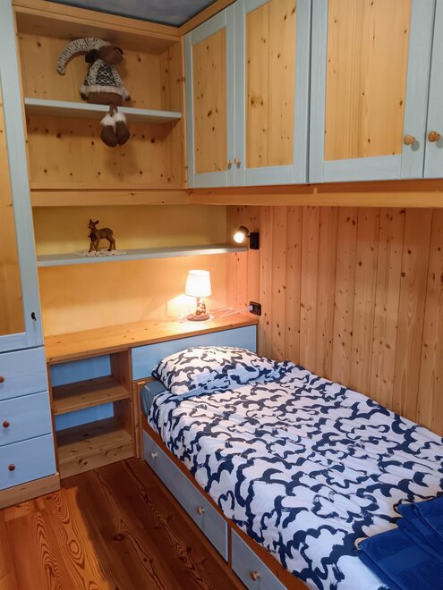 The apartment can accommodate up to 4 people and is arranged over two floors, with a total area of 75 sqm. It is entirely furnished with spruce wood.