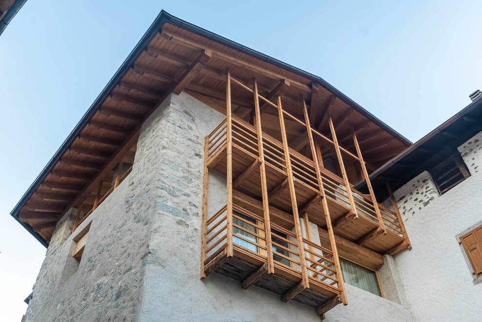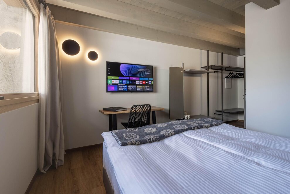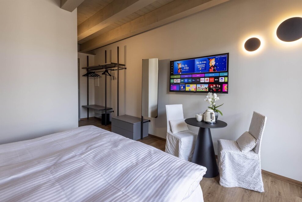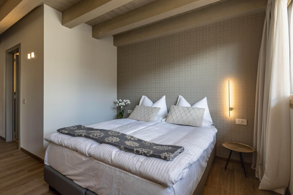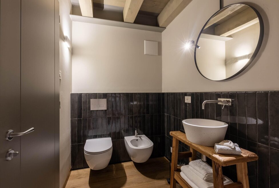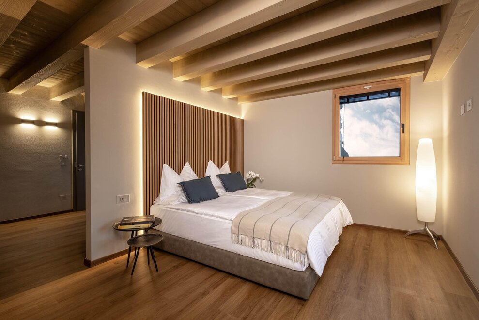 Okolo společného prostoru se rozkládají čtyři pokoje, každý s vlastní koupelnou a umístěný na jiném patře, aby bylo zajištěno soukromí a pohodlí. Podlahy z přírodního dřeva, světlé tóny, tapety a dřevěné obklady definují teplé a uvolněné atmosféry. Koupelny, pečlivě navržené v každém detailu, kombinují moderní design a řemeslnou práci, s sprchami na úrovni podlahy, transparentními skly a umyvadlovými skříněmi inspirovanými kreslicími stojany, vyrobenými ze starého dřeva.