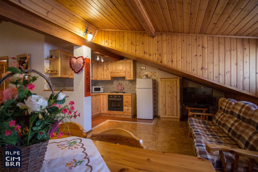 Byt o rozloze přibližně 50 m² -podkroví v druhém patře klidného domu na břehu Jezera Lavarone. Kuchyně vybavená myčkou, troubou, varnou deskou a lednicí. Manželská ložnice a třílůžkový pokoj s postelemi na zemi. K dispozici parkovací místo a sklad na lyže a kola