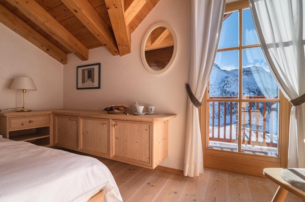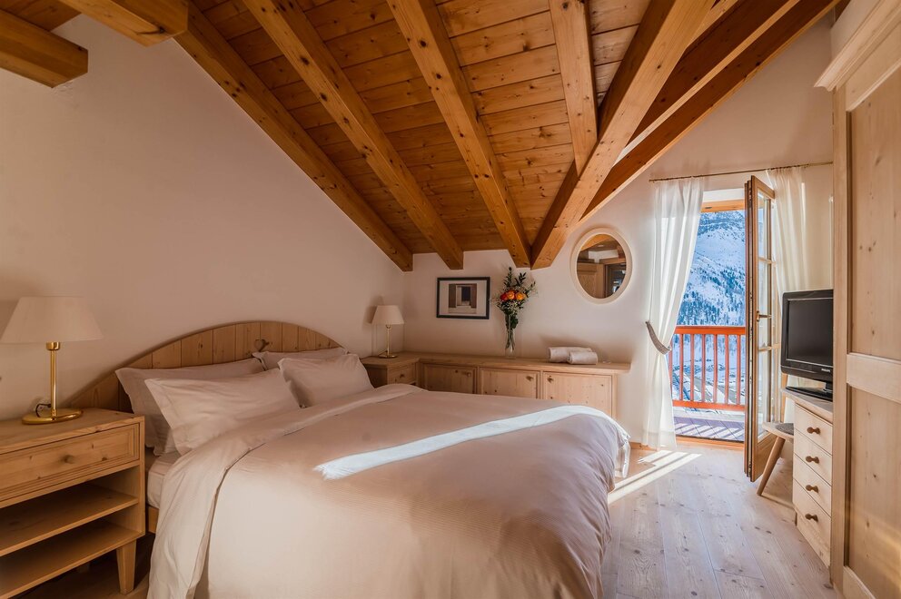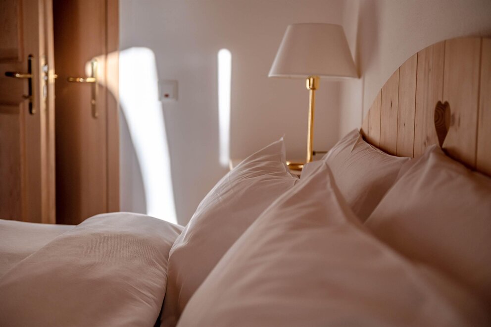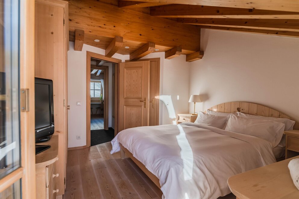 15 m², teplý, světlý a útulný dvoulůžkový pokoj, s jednoduchým dřevěným nábytkem a přírodními materiály jako v klasickém alpském stylu.