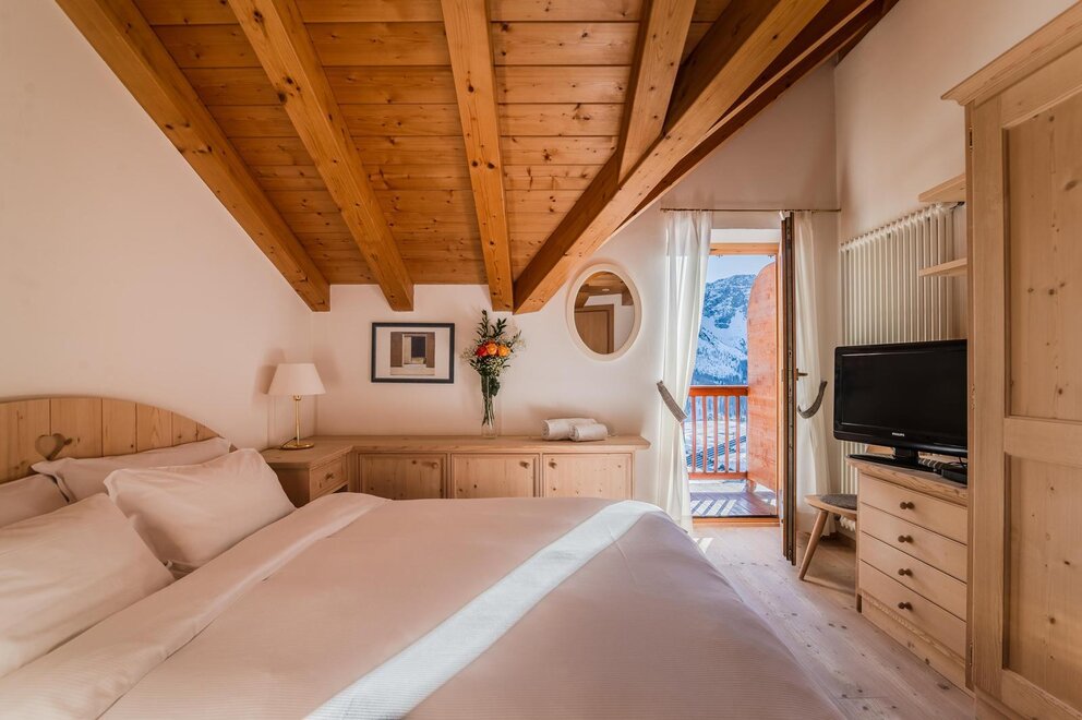 S koupelnou se sprchovým koutem, balkonem s úchvatným výhledem přímo na sjezdovky, hřeben Col Margherita a okolní DolomityVybavení pokojů