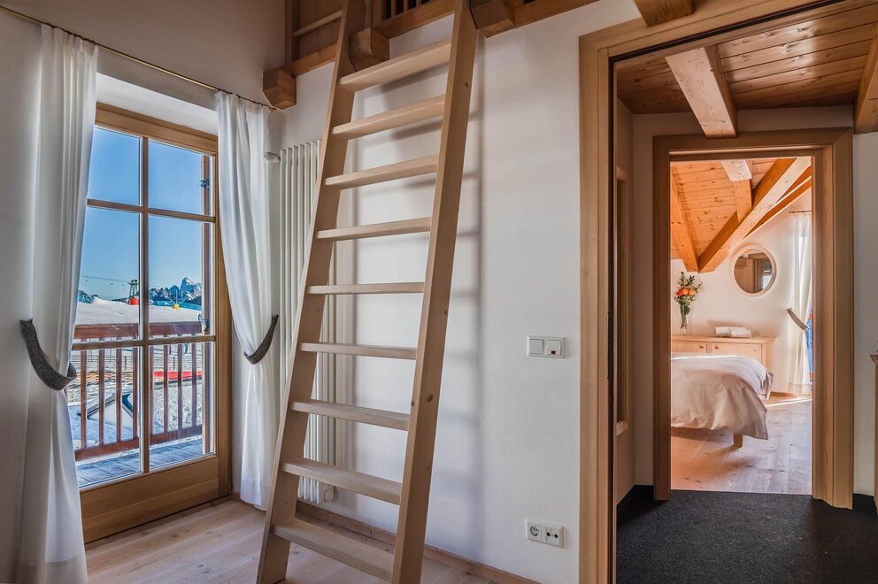 35 m², prostorný, útulný a nesmírně pohodlný, skládající se ze dvou propojených oddělených místností, určený pro 2 až maximálně 4 osoby: ložnice s manželskou postelí a malý obývací pokoj s pohodlnou rozkládací pohovkou, s jednoduchým dřevěným nábytkem a přírodními materiály, jako v nejklasičtějším alpském stylu.