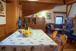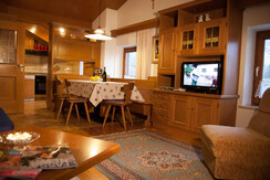 PODKROVNÍ APARTMÁN V TYPICKÉM TYROLSKÉM STYLU VÁM PŘENÁŠÍ VŠECHNY TEPLÉ POCITY Z DŘEVA NA PLOŠE 110 M². NACHÁZÍ SE VE TŘETÍM PATŘE A DISPOZITUJE KUCHYNÍ VYBAVENOU VŠÍM POTŘEBNÝM, PROSTORNÝM OBÝVACÍM POKOJEM S POHOVKOU A SATELITNÍ TELEVIZÍ, KTERÉ VÁS PŘIMĚJÍ CÍTIT SE JAKO DOMA.