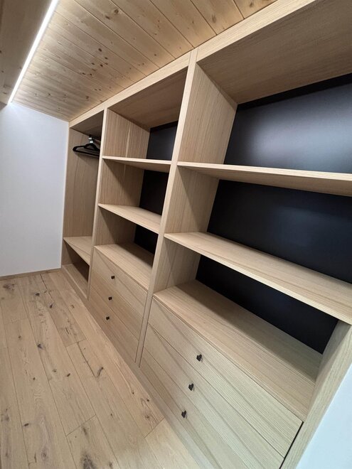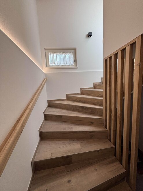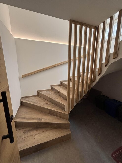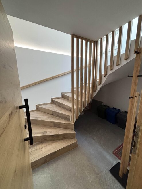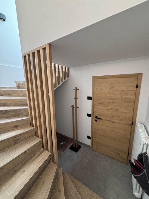 - Dřevěnou podlahou v ložnicích a porcelánovou dlažbou v ostatních prostorách,