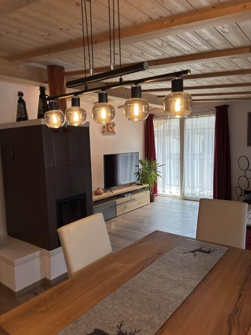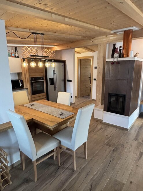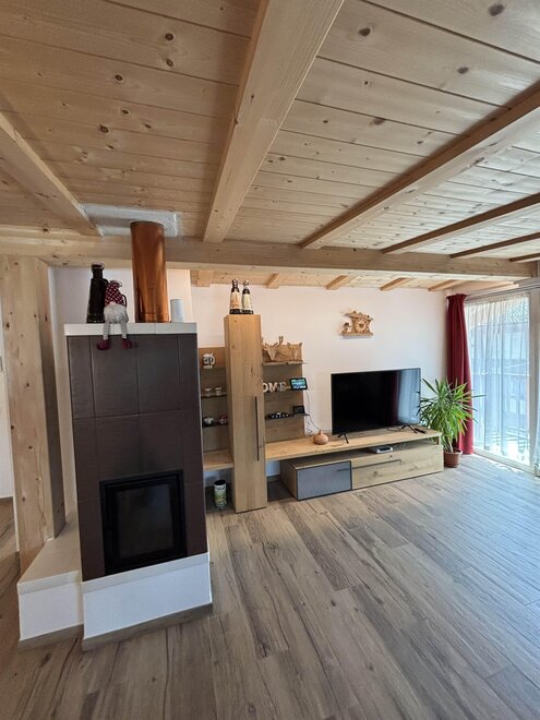 - Obývací pokoj se Smart TV Led 55” a typickou ladinskou kamnou