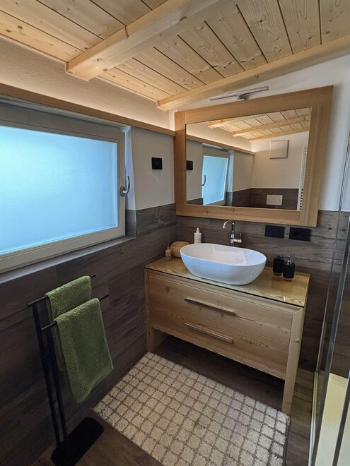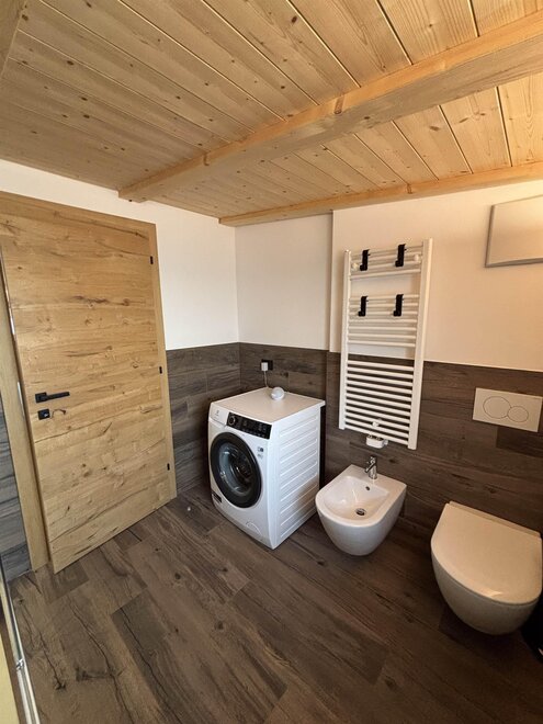 - Koupelnu s prostorným skleněným sprchovým koutem a dešťovou sprchou, vybavenou pračkou