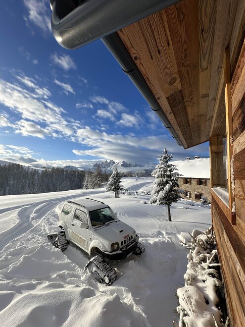 Služba sněžného skútru nebo sněžného pávu vás dopraví k naší chatě.