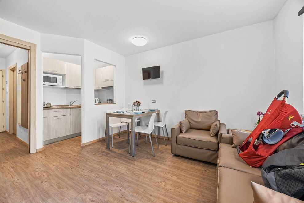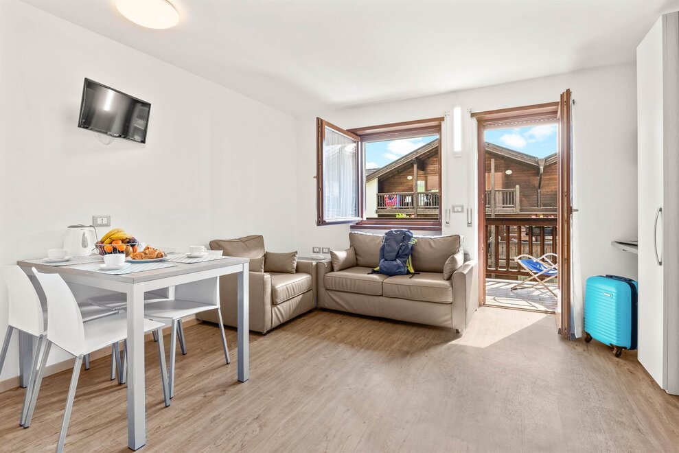 Tento typ apartmánu byl kompletně zrekonstruován a sestává z vstupu s patrovou postelí odděleného od obývací části posuvnými dveřmi, v obýváku se nachází jídelní kout a stahovací manželská postel, oddělený kuchyňský kout, koupelna se sprchou, balkon s výhledem na údolí se stolem a židlemi. Všechny apartmány jsou obsluhovány výtahem a mají LCD TV, telefon, trezor, plně vybavenou kuchyň s ledničkou, nádobím, talíři a sklenicemi, mikrovlnnou troubou, kávovar, sadu na úklid kuchyně (čisticí prostředek, houbička a utěrka), koupelnu se sprchou, bidetem, toaletou a fénem na vlasy. Dále jsou poskytovány deky, polštáře a ložní prádlo a ručníky s týdenní výměnou.