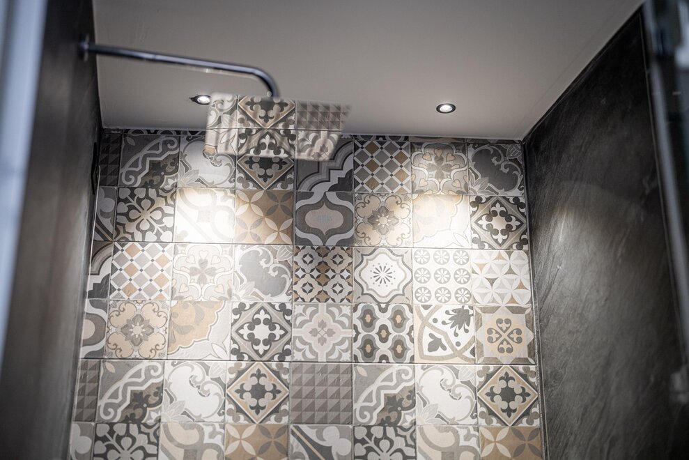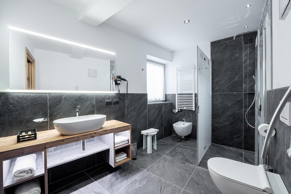 emergency call button in the bathroom, ample space in the shower and bathroom