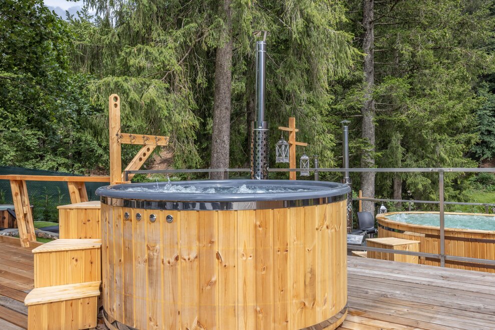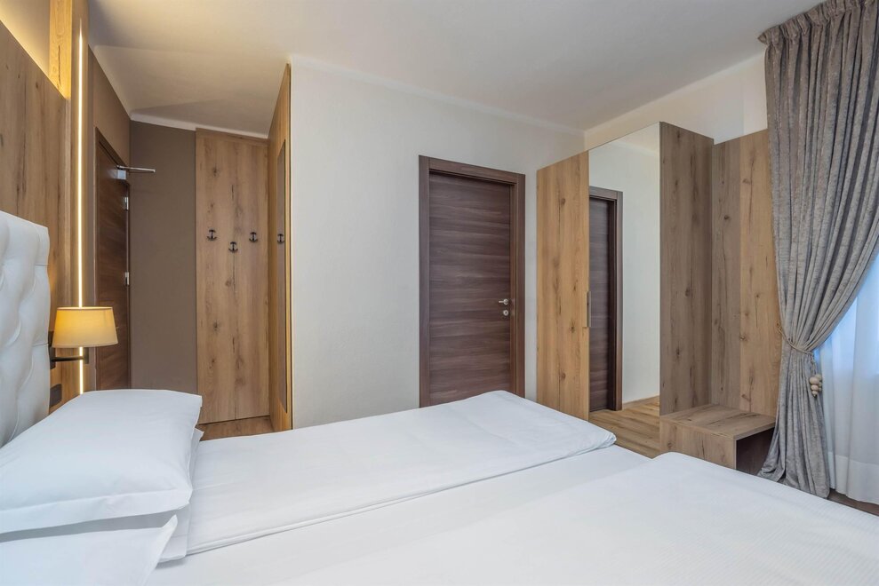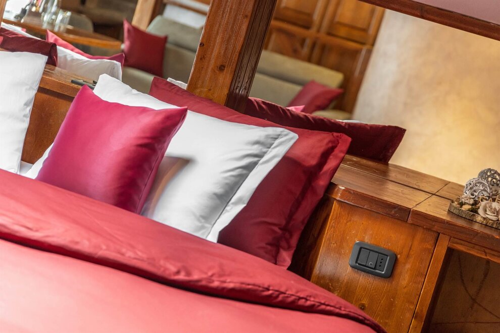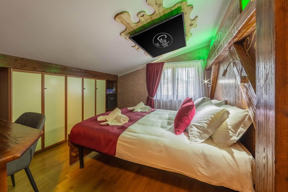 SUITE - Pokoj s průměrem otočné postele 2,6 m, + pohovka / postel, 1 LED TV 40 "a 1 smart TV 52", dvojité skříně, peřina, župany, trezor, parkety, minibar, výrobník ledu, široký výběr šampaňského a likérů, voda, kávovar Illy, vířivá vana a sprchový box s parní lázní a vířivkou, sauna, koupelnový nábytek, fén, soli a různé zdvořilostní sady.