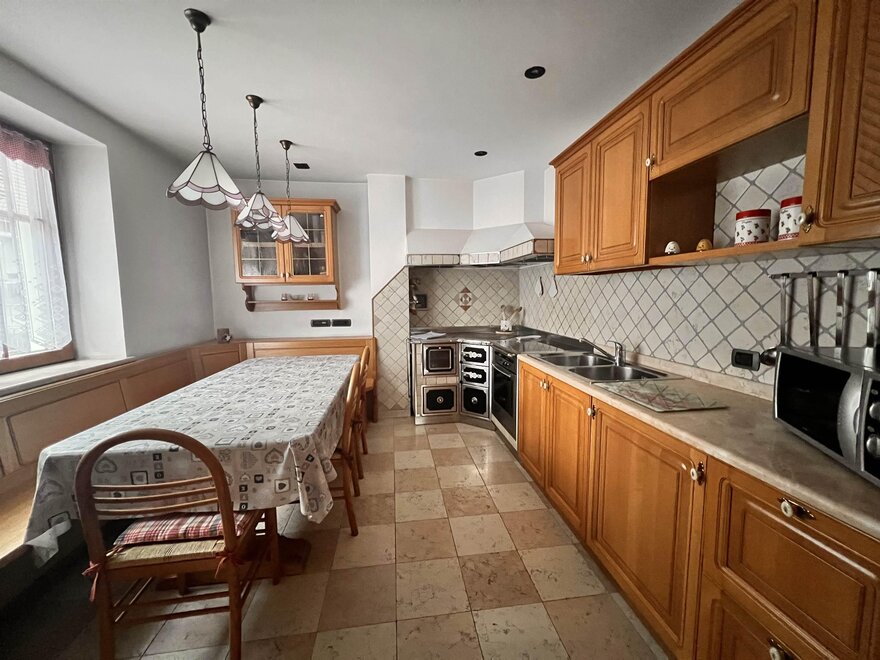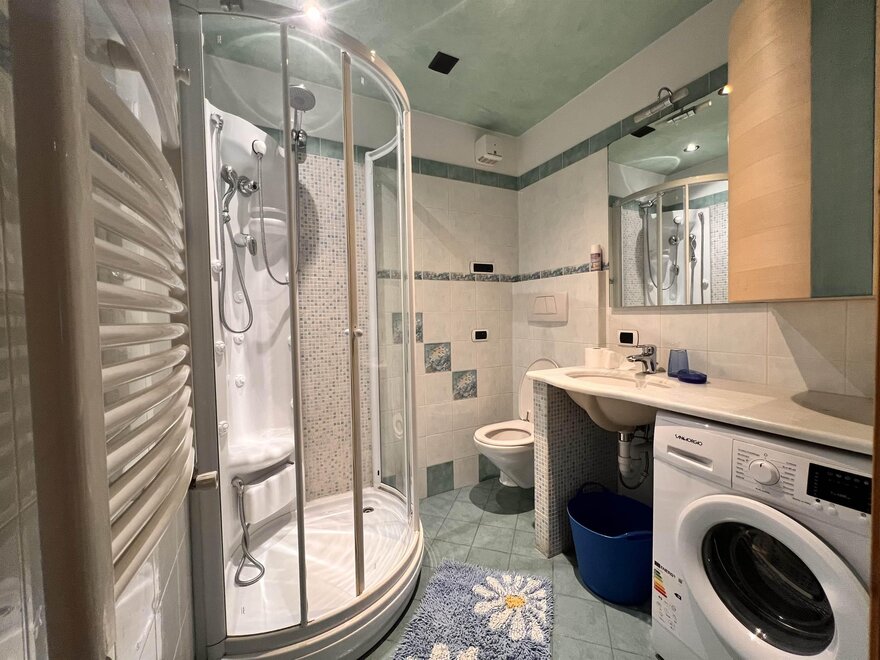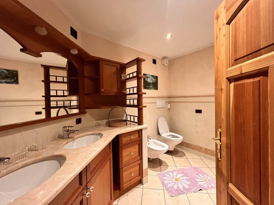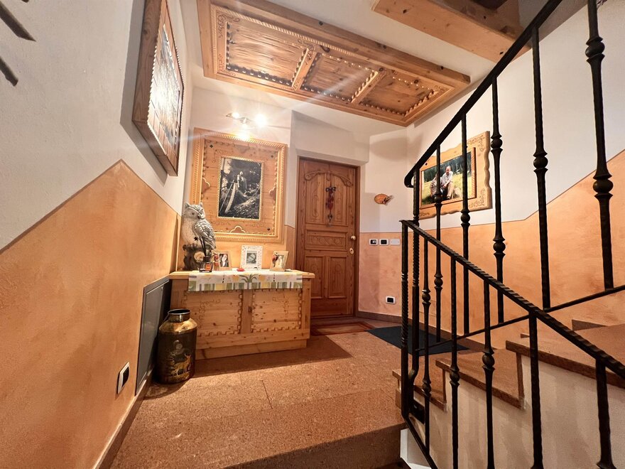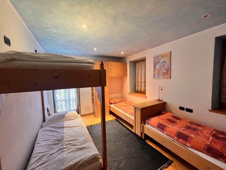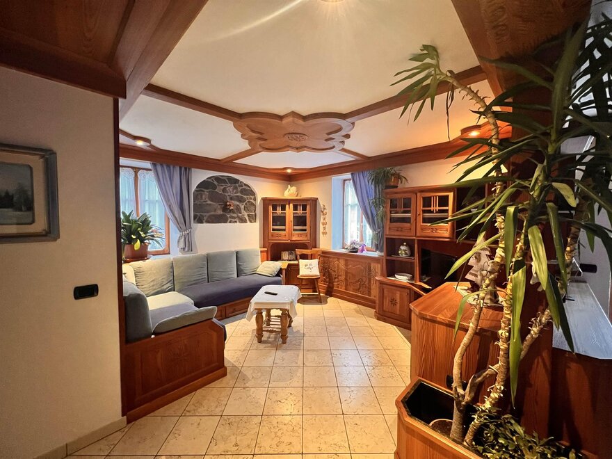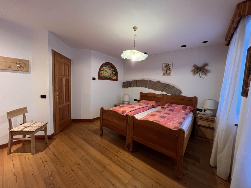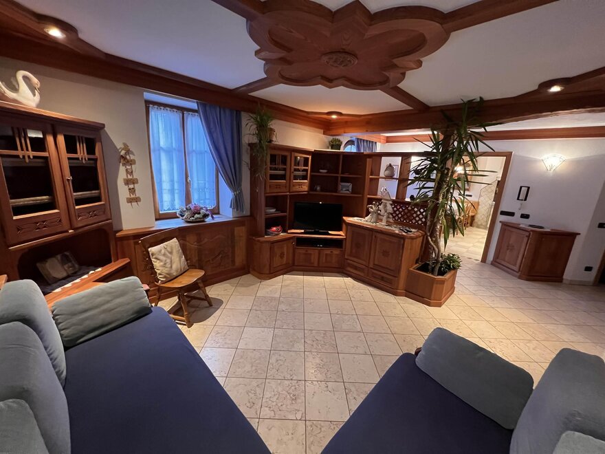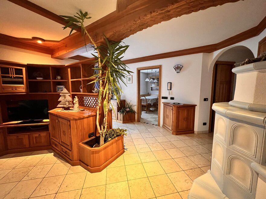 Pěkný byt o velikosti 100 m², nacházející se v 1. patře, skládající se z 1 manželské ložnice a 1 prostorné dvoulůžkové ložnice se 2 patrovými postelemi, prostorný obývací pokoj s dřevěnými stěnami z larixu z údolí Fiemme, obytná kuchyně, 1 koupelna se dvěma umyvadly a 1 koupelna se sprchou. Byt má 2 balkony, zahradu vybavenou slunečníky.