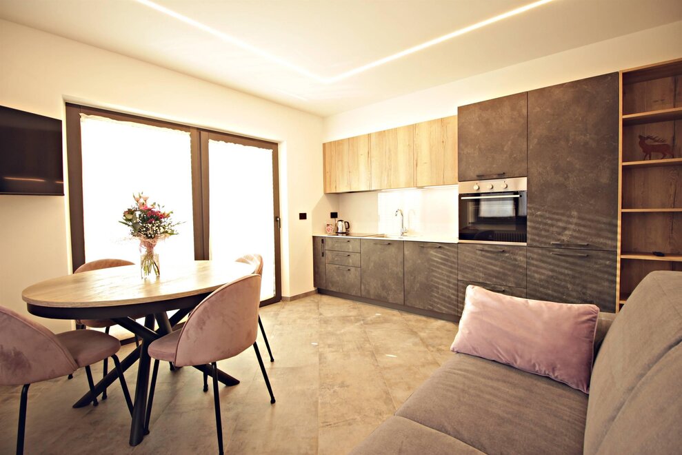 crockery and cutlery , louka, dřez na mytí nádobí, kuchyňský kout, prostírání a prádlo do kuchyně, lednice, apartment without fitted carpet, kuchyň, vlasový fén, toaletní prádlo, prošívané deky, pračka, nekuřácký pokoj, moderní vybavení nábytkem, myčka nádobí, TV, zahrada, trouba, balkón, elektrický krb, povlečení k dispozici, mikrovlnná trouba, žehlička, topení, terasa