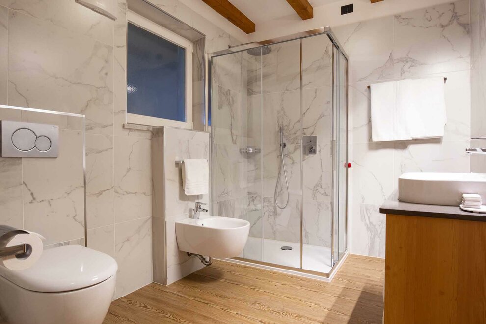 počet koupelen: 2, sprcha, oddělené WC, tekoucí studená/teplá voda, počet toalet: 2, bidet, WC, koupací vana