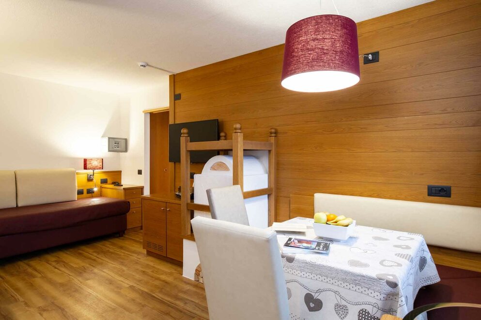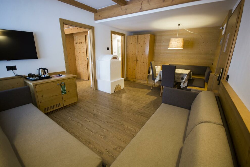Prostorné rodinné pokoje pro 3-4 osoby, skládající se z manželské postele, obývacího pokoje se 2 rozkládacími pohovkami, barového koutku, koupelny se sprchou, balkonu. Vybavené LCD TV, telefonem, trezorem, fénem. NAŠE SLUŽBY Recepce otevřená od 08:00 do 23:00 Bar otevřený od 08:00 do 23:00 Čítárna s koženými pohovkami a velkoplošnou TV Spa Ega Pura a nový panoramatický bazén Bezplatné Wi-Fi připojení k internetu Široké bezplatné soukromé parkoviště s několika krytými místy V ZIMĚ Skladiště na lyže s videonahrávacím systémem a sušičkou na boty Sleva 50 % na jízdenku na Skibus Sleva 10 % na půjčovnu lyží a zimního vybavení V LÉTĚ Široká zahrada s dětskými hračkami, altánem a grilem Video monitorované skladování jízdních kol a bezplatný pronájem jízdních kol