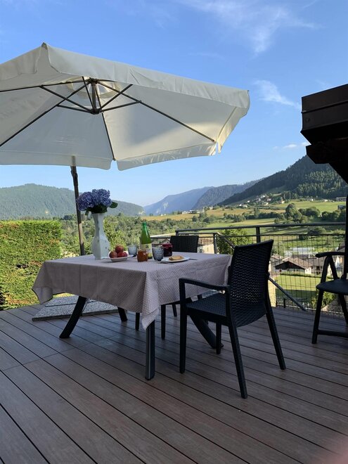 Prostorný obývací prostor/kuchyně, který spojuje s pohodlnou terasou vybavenou stolem, kde si můžete pochutnat na jídle venku a užívat si nádherný výhled na náhorní plošinu a hory.