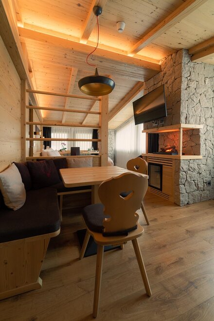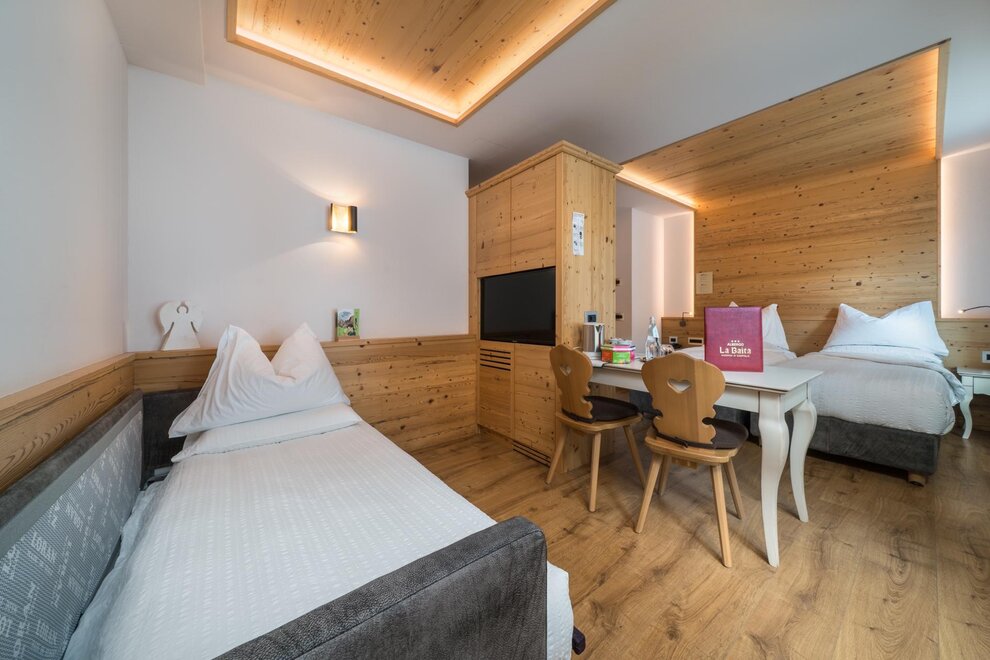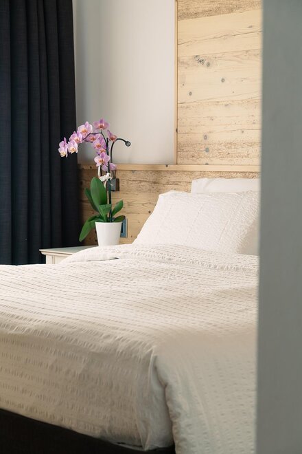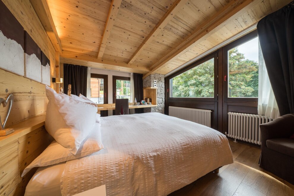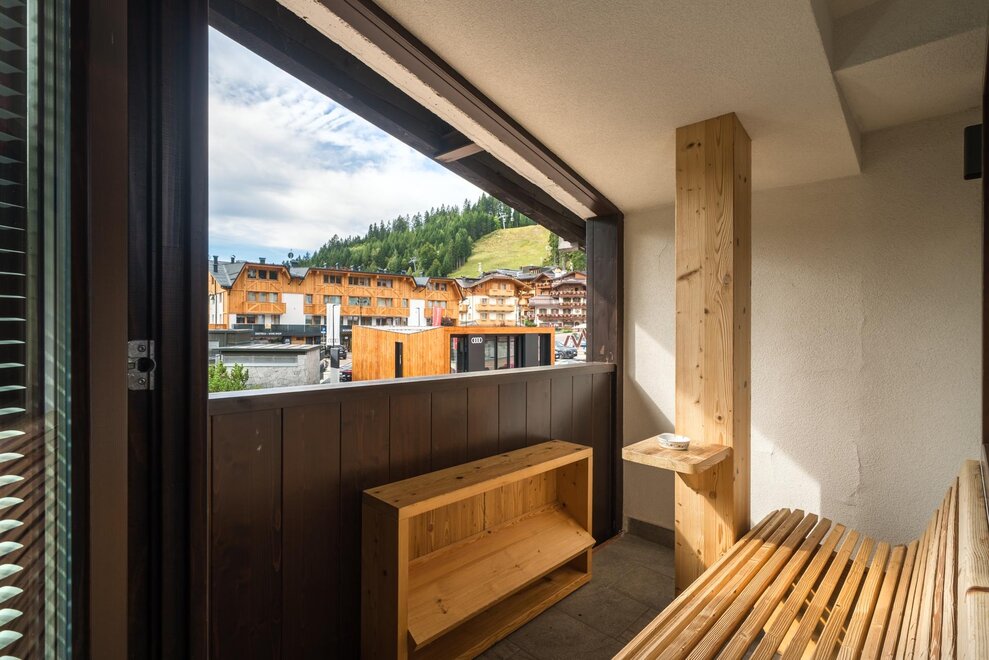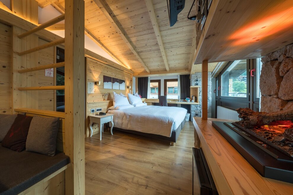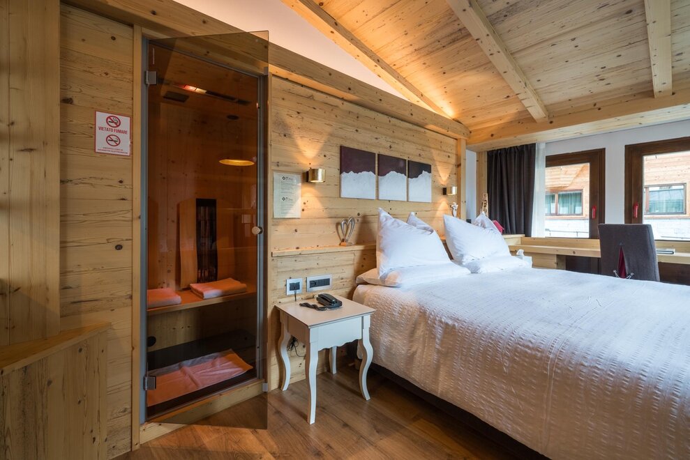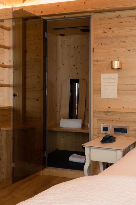 Pokoj o rozloze 40 m² s manželskou postelí a francouzskou postelí, soukromou saunou na pokoji a balkonem.