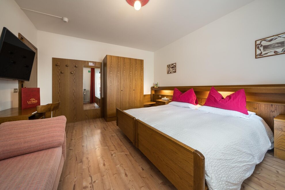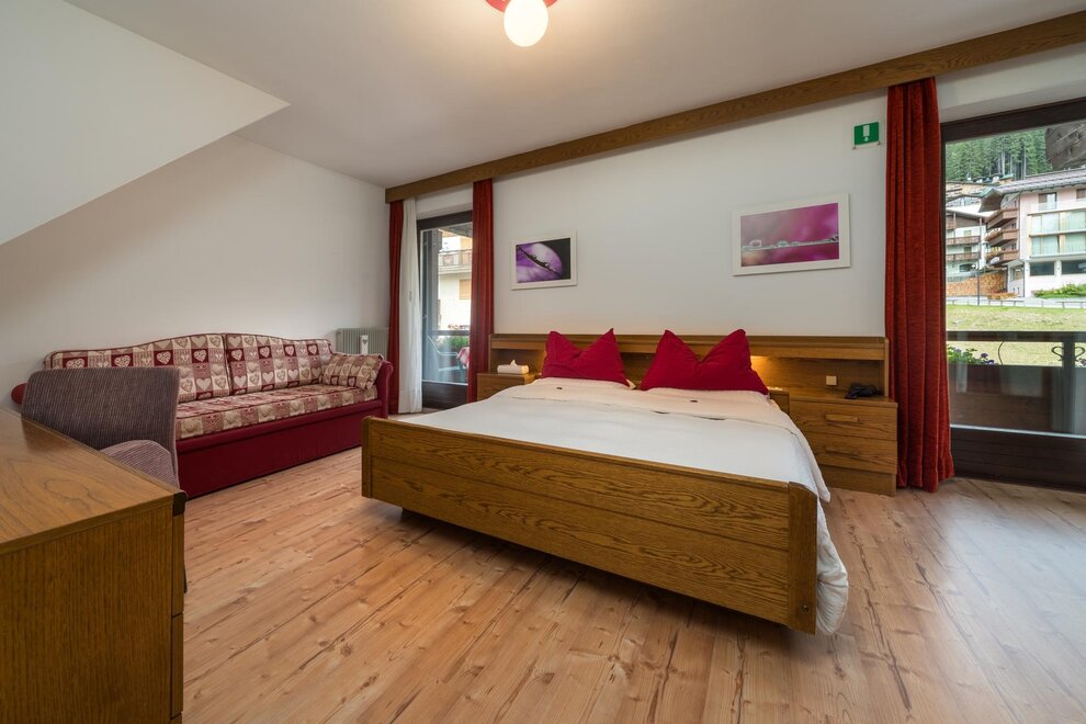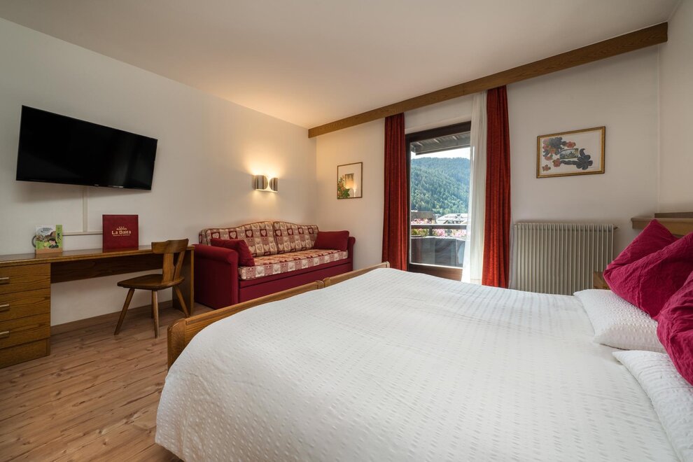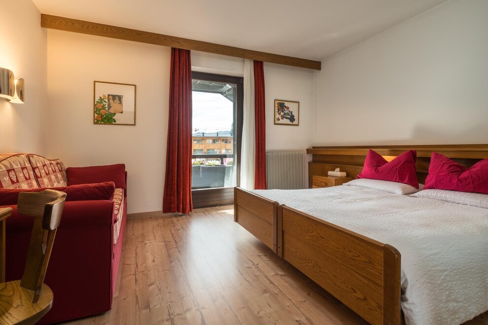 Pokoj o rozloze 26 m² s manželskou postelí, rozkládacím gaučem a balkonem.