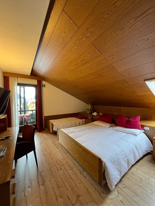 Naše největší pokoj o rozloze 26 m² s manželskou postelí a francouzskou postelí, rozkládací pohovkou a balkonem.