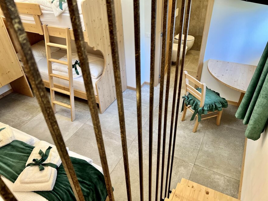 Disponuje manželskou postelí ( kterou je možné na požádání rozdělit), patrovou postelí (2 místa) a doplňkovým lůžkem na galerii.