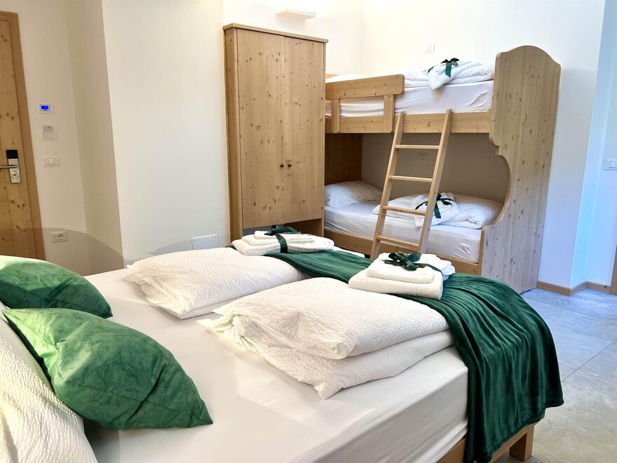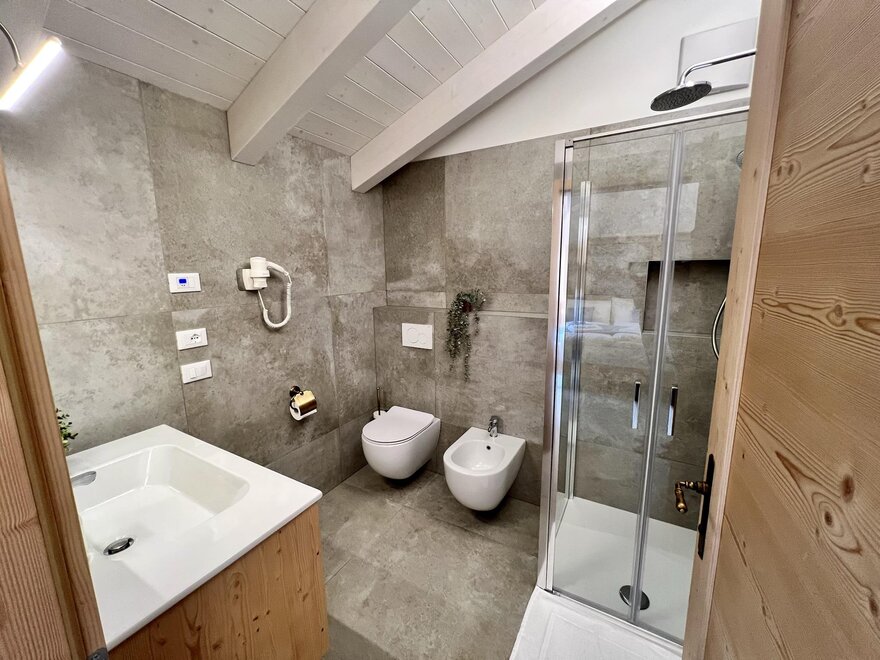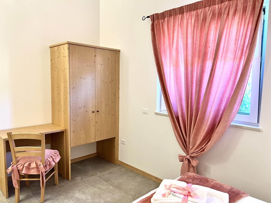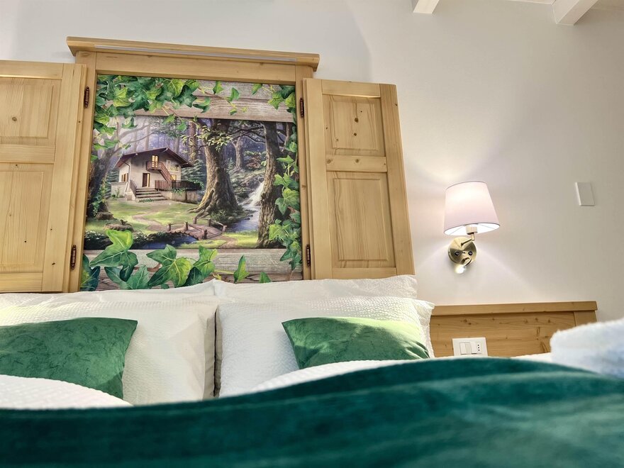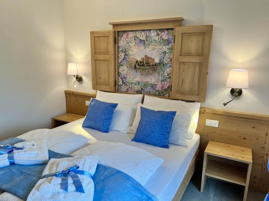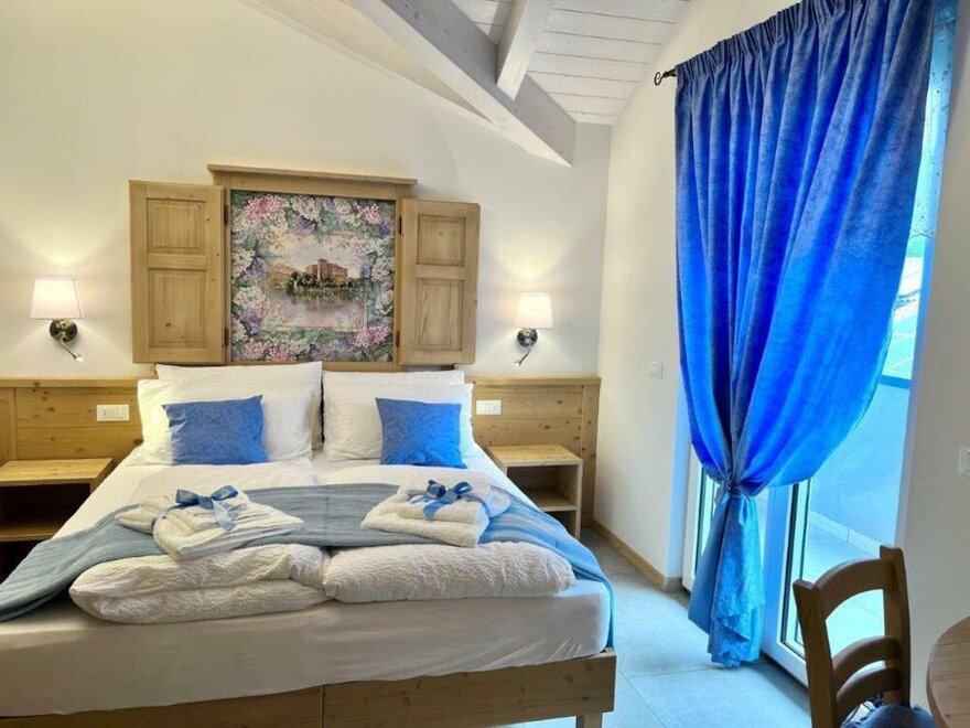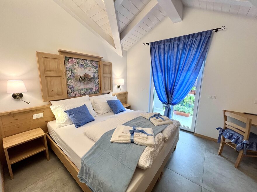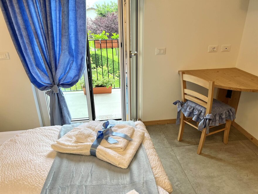 Disponuje manželskou postelí, vlastní koupelnou a terasou, ze které si můžete vychutnávat výhled na zahrady čtvrti a výhled na Dolomity di Brenta.Vybavení pokojů