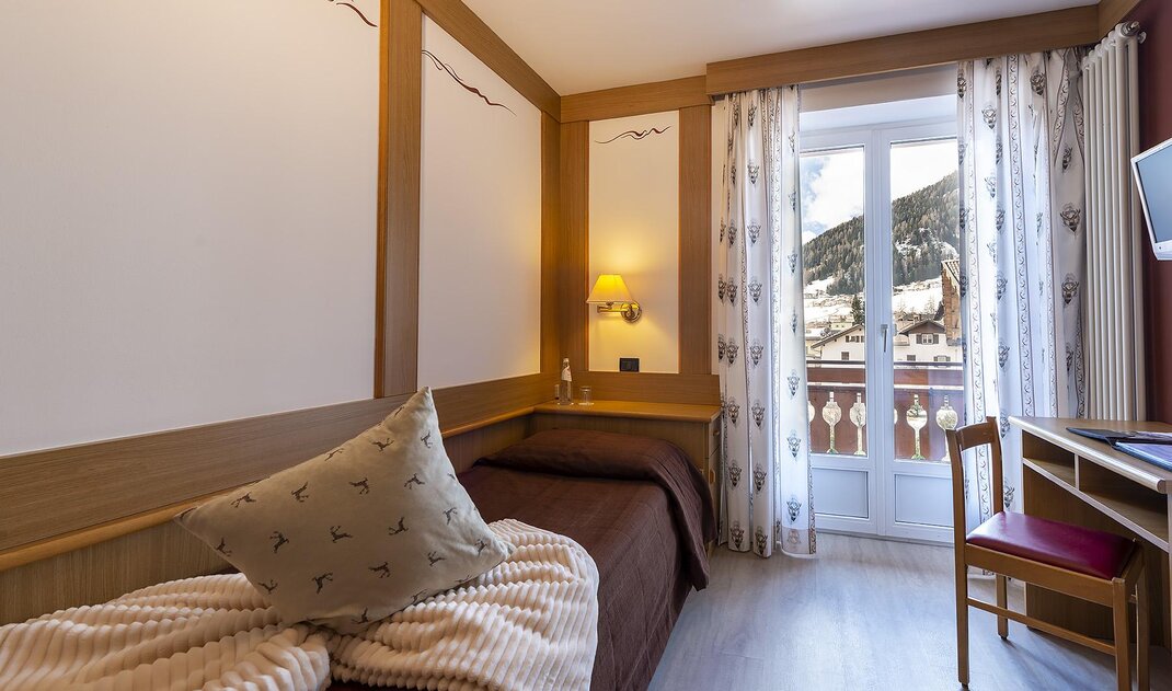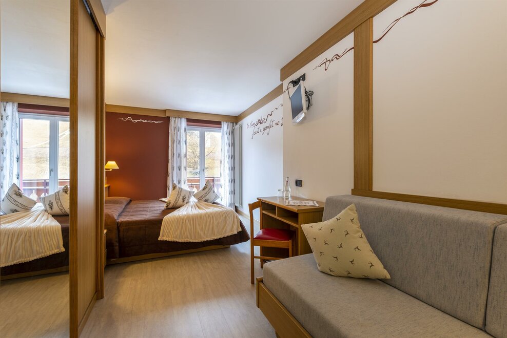 Wider room type compared to Comfort category. Double bed (that can be divided into two single beds upon request) with possibility to add an extra bed. They feature a desk, a sofa or a coffee table, tea kettle, telephone, flat screen TV, safe, balcony. Bathroom with tub or shower, hairdryer. Bathrobe for wellness center. The picture is not binding but only indicative of room category.