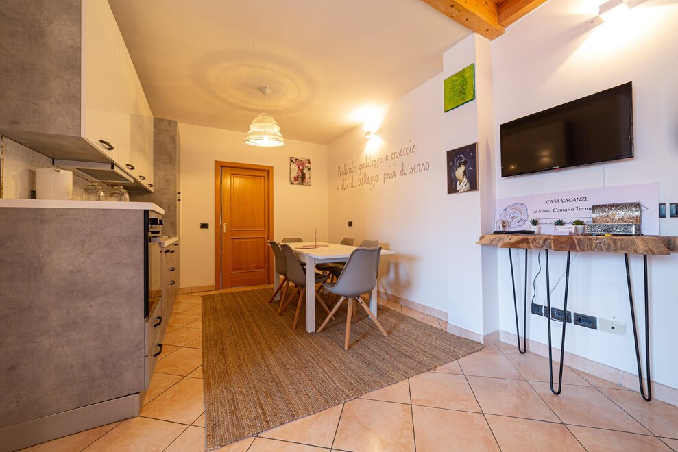 Útulný apartmán "Le Muse Comano Terme Holiday" se nachází v klidné části Comano Terme, v Poia, a je ideálním ubytováním pro klidnou dovolenou s rodinou nebo přáteli v jakémkoliv ročním období. Je to velmi dobře zařízený apartmán ve stylu rustikálního chic.