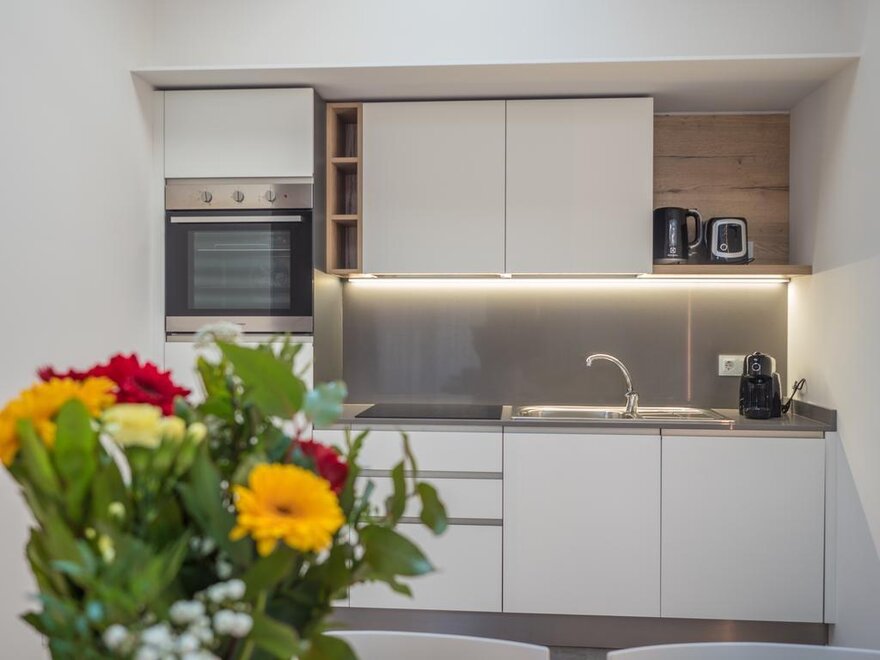 prostorné privátní balkony - TV s plochou obrazovkou - plně vybavená kuchyně - indukční varná deska - mikrovlnná trouba - trouba - toustovač - elektrická konvice - lednice a mrazák - ložní prádlo - toaletní papír - ručníky - bidet - sprcha - soukromá koupelna - WC - ekologické hygienické výrobky zdarma - ložní prádlo - fén - výměna na vyžádání a za příplatek