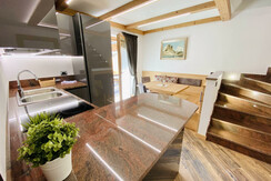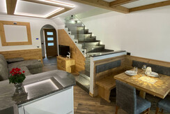 Nový rodinný dům s vlastními vchody, situovaný ve dvou patrech (přízemí a první patro), který pohodlně ubytuje 6 osob. Obývací část v přízemí má přímý přístup do krásné oplocené zahrady vybavené slunečními lehátky, křesly a malou pohovkou (k užívání výhradně pro dům). Kuchyň a obývací pokoj jsou v jedné velké, velmi světlé místnosti, která se otvírá do zahrady. Kuchyň je kompletně vybavená indukční deskou, lednicí s malým mrazákem, myčkou, tradiční troubou a mikrovlnnou troubou a televizí. Obývací pokoj s televizí a velkou pohovkou a křeslem. K dispozici je bezplatná síť Wi-Fi. Noční zóna, v prvním patře, se skládá ze tří ložnic, všechny s balkónem. Dvě manželské ložnice a jedna ložnice se dvěma jednolůžky. K dispozici jsou dva koupelny se sprchovým koutem a fénem. V jedné z koupelen je také turecká lázeň, která pojme 6 osob.