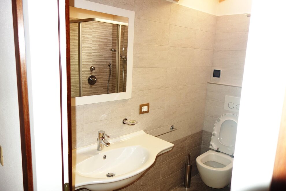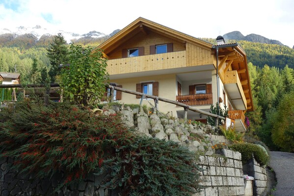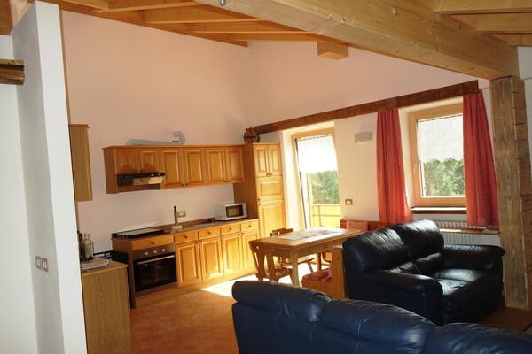 Pohodlný podkrovní byt ve druhém patře, prostorný obývací prostor s obývacím pokojem a kuchyní, tři ložnice, balkón, dvě koupelny, úložný prostor v bytě, dům se nachází v klidné oblasti, s parkováním a zahradou, nádherný výhled na Dolomity, pračka, žehlící prkno.