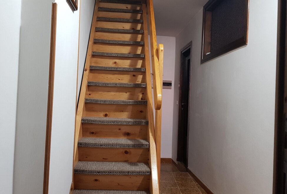 Byt rozložený ve dvou patrech: v prvním patře kuchyň s myčkou, mikrovlnnou troubou a kávovarem; obývací pokoj, manželská ložnice, koupelna s WC a umyvadlem; ve druhém patře podkrovní manželská ložnice nebo s oddělenými postelemi, pokoj se 2/3 jednolůžkovými postelemi, koupelna se sprchou a pračkou. Dřevěné schodiště, které spojuje první patro s podkrovím. Parkování pro jedno auto venku na společném prostranství s ostatními obyvateli. Možnost rezervace garáže na požádání a za poplatek.